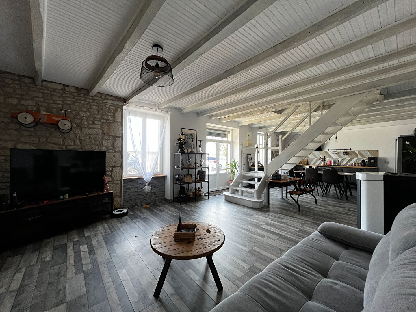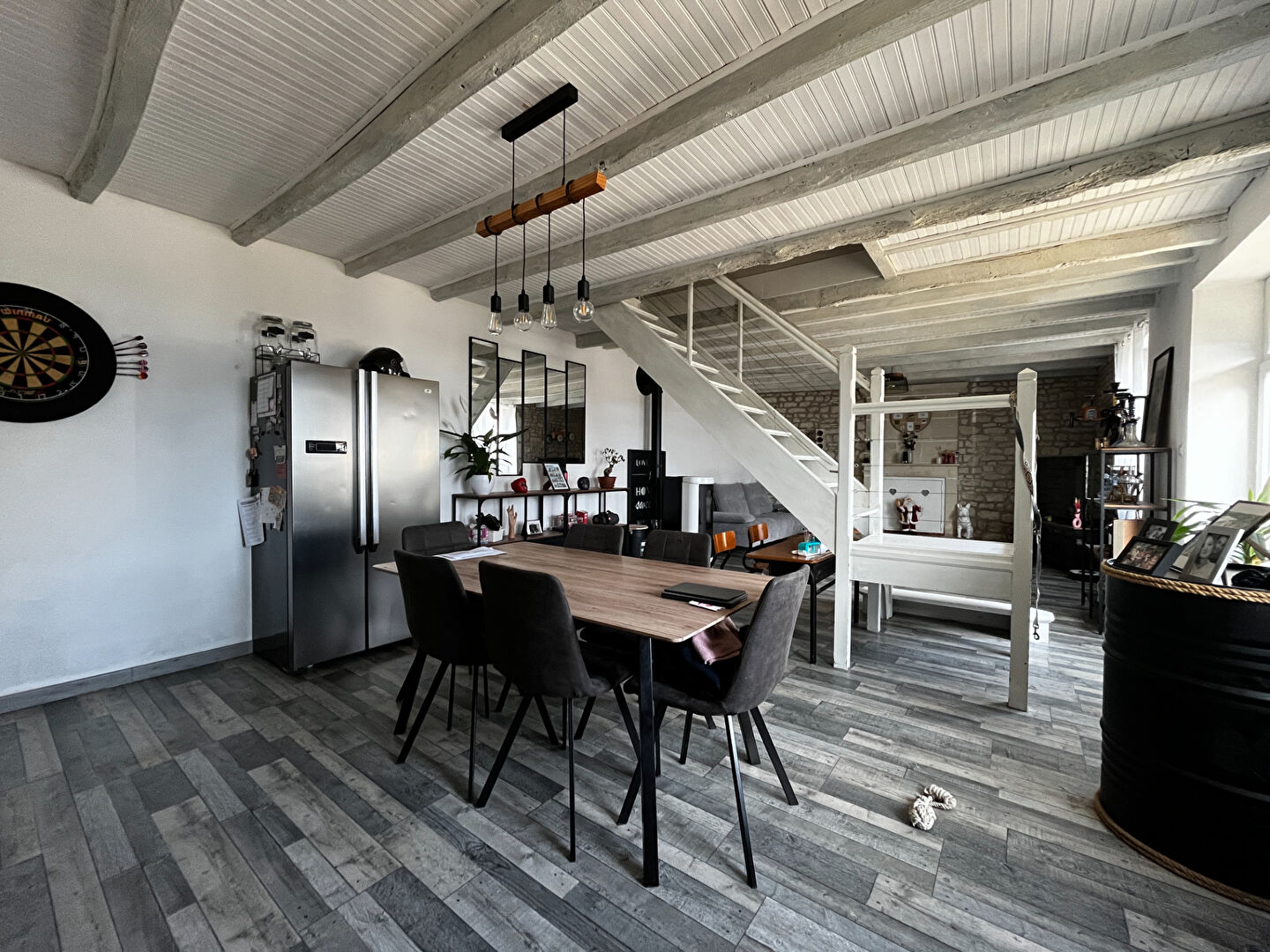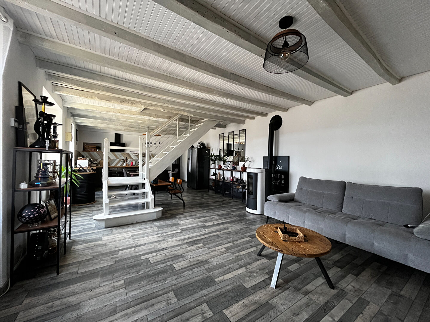 Dès l'entrée, vous serez séduit par la pièce de vie spectaculaire de 50 m². Ce volume baigné de lumière intègre une cuisine moderne entièrement aménagée et équipée, s'ouvrant sur un séjour chaleureux sublimé par un poêle à granulés. Le rez-de-chaussée est complété par une buanderie pratique, une salle de bains et un WC indépendant.