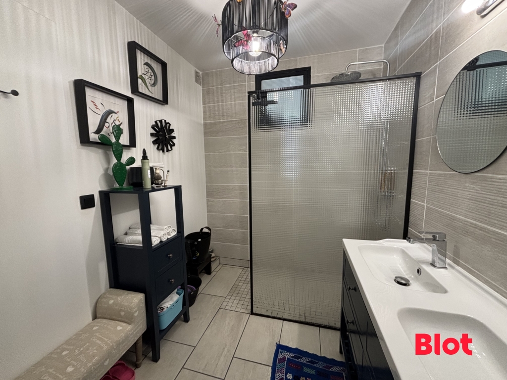 Vous trouverez au rez-de-chaussée une entrée, une belle pièce de vie traversante est-ouest avec poêle à granulés, cuisine ouverte entièrement aménagée et équipée, accès terrasse. Chambre avec salle d'eau privative. WC indépendant.