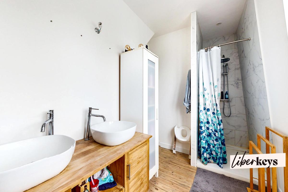 - Une salle d'eau moderne avec fenêtre, double vasque et WC,