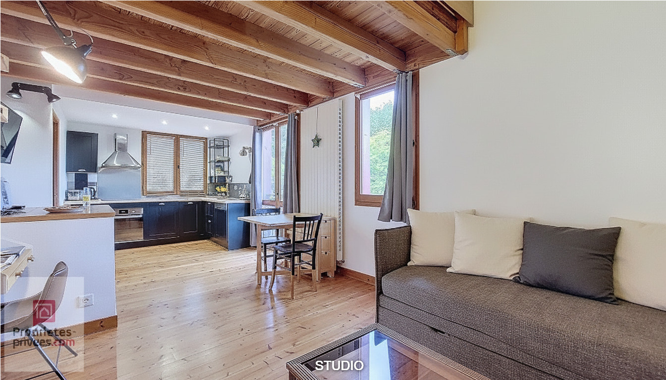 A l'étage, un espace indépendant permet d'imaginer différents usages : accueil, activité, séminaire et espace personnel avec son studio: salon/cuisine équipée avec accès terrasse bois. Salle d'eau/wc. Chambre en mezzanine.