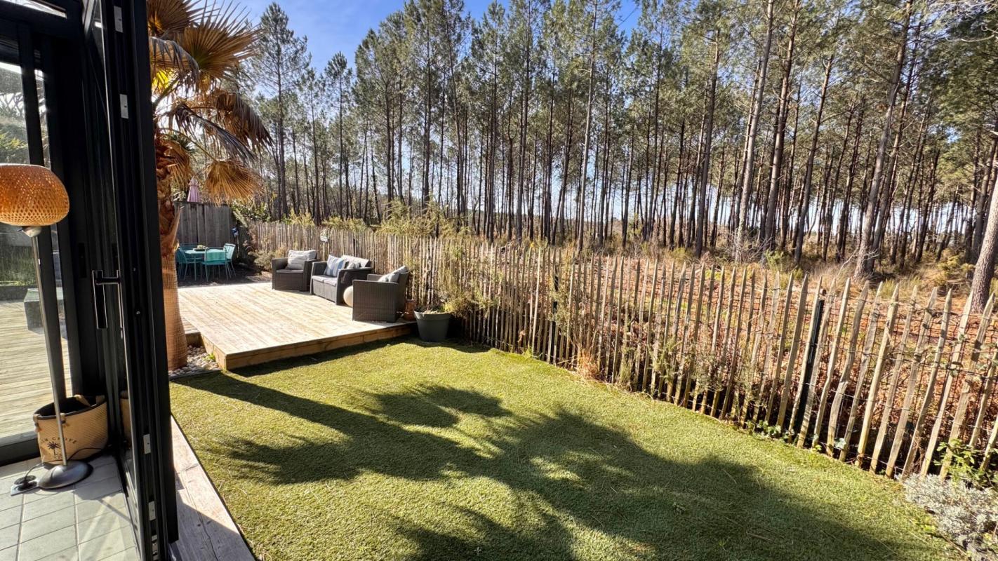 LEGE BOURG Appartement rare avec jacuzzi et 150 m² de jardin privatif face à la forêt ! dans une petite copropriété, entièrement de plain-pied, il vous offre une pièce principale lumineuse avec cuisine ouverte sur salon et une pièce repas dans une véranda chauffée véritable pièce de vie avec vue forêt. 2 chambres avec terrasse côté Est, salle de bains, wc. 45 m² de terrasse bois qui accueille un beau Jacuzzi, chauffage au gaz de ville par le sol, cet appartement n'a rien de commun, c'est un véritable joyau ! Le jardin privatif de 150 m² fait oublier qu'il s'agit d'un appartement et non d'une maison. Vous bénéficierez aussi de 2 places de parking privées. Vous n'osiez en rêver pensant qu'elle n'existait pas, et pourtant cette pépite n'attend que vous !