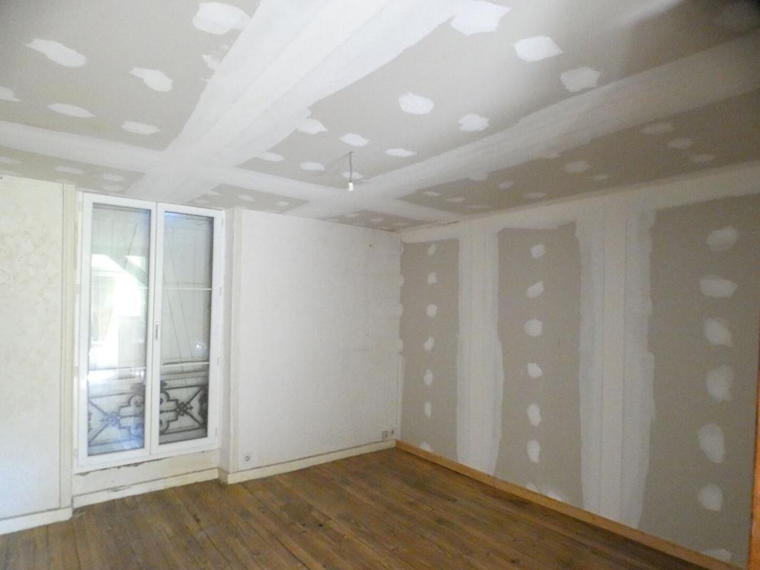A l'étage : une entrée côté cour, une cuisine, un salon-sejour, 2 grandes chambres (14.5 et 12.8 m²) et une salle d'eau avec WC.