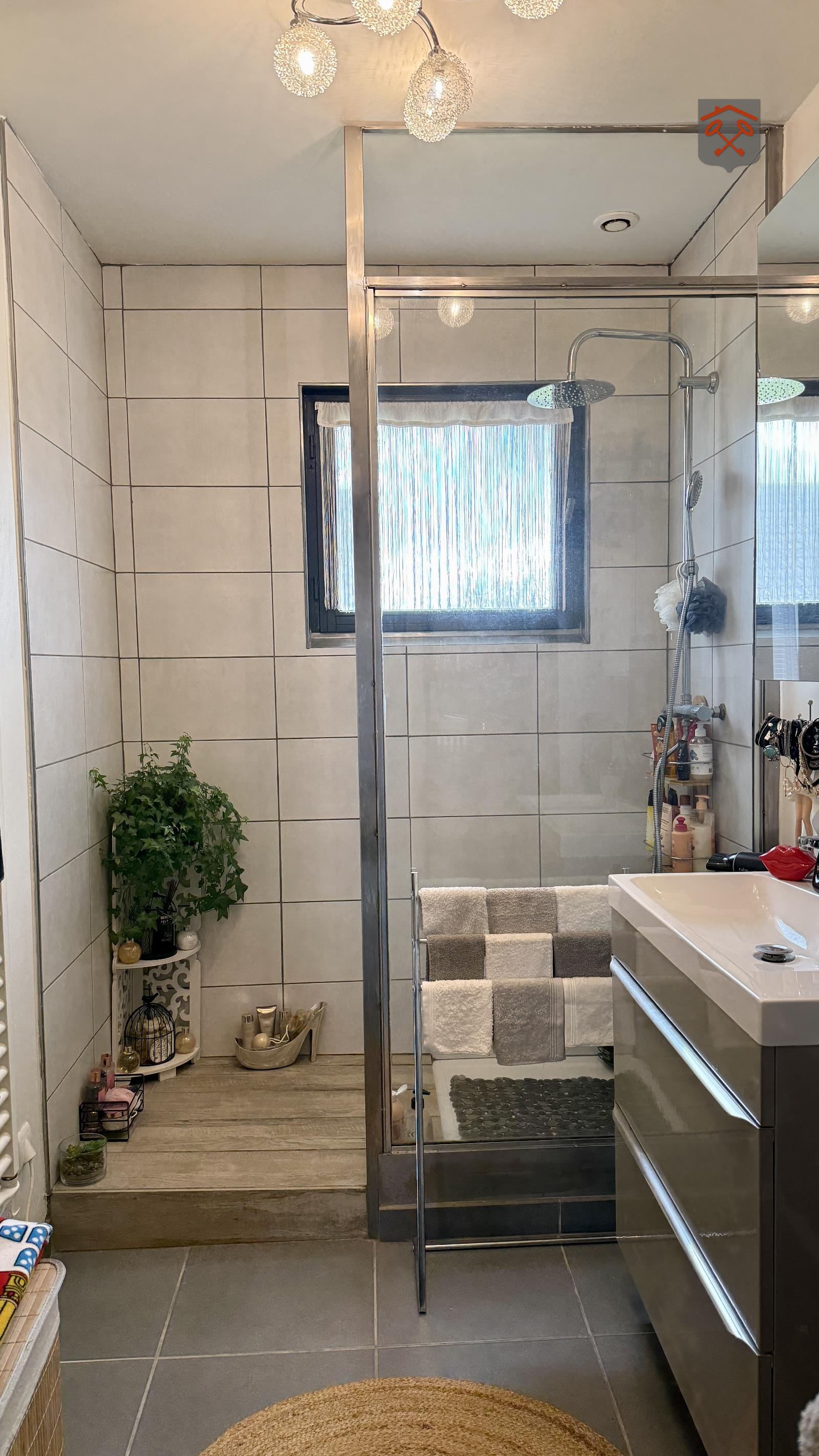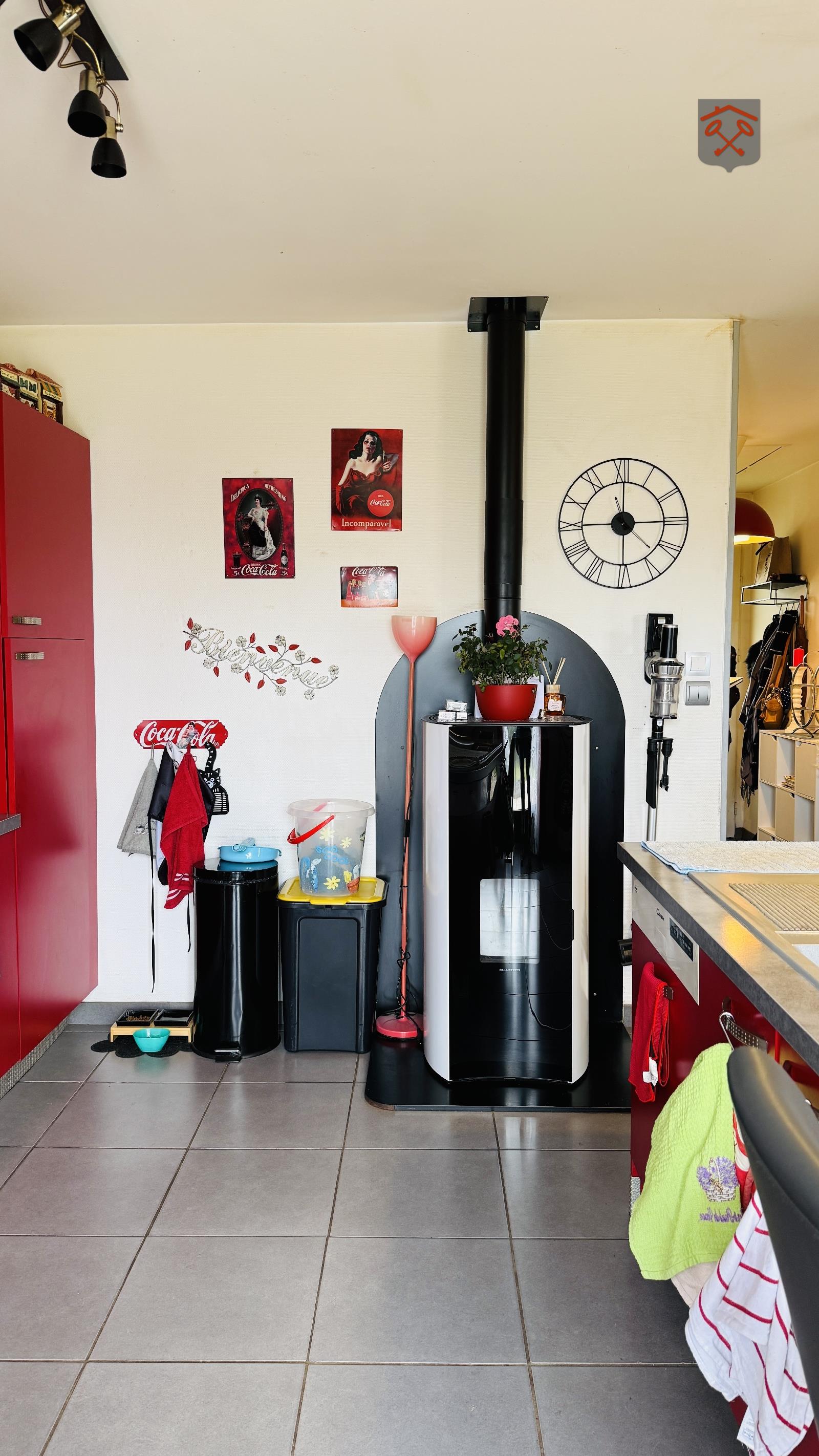 Entrée, pièce de vie de 33 m² avec poele à granulés et sa cuisine aménagée ouverte, 3 chambres, salle d'eau ( refaite), wc.