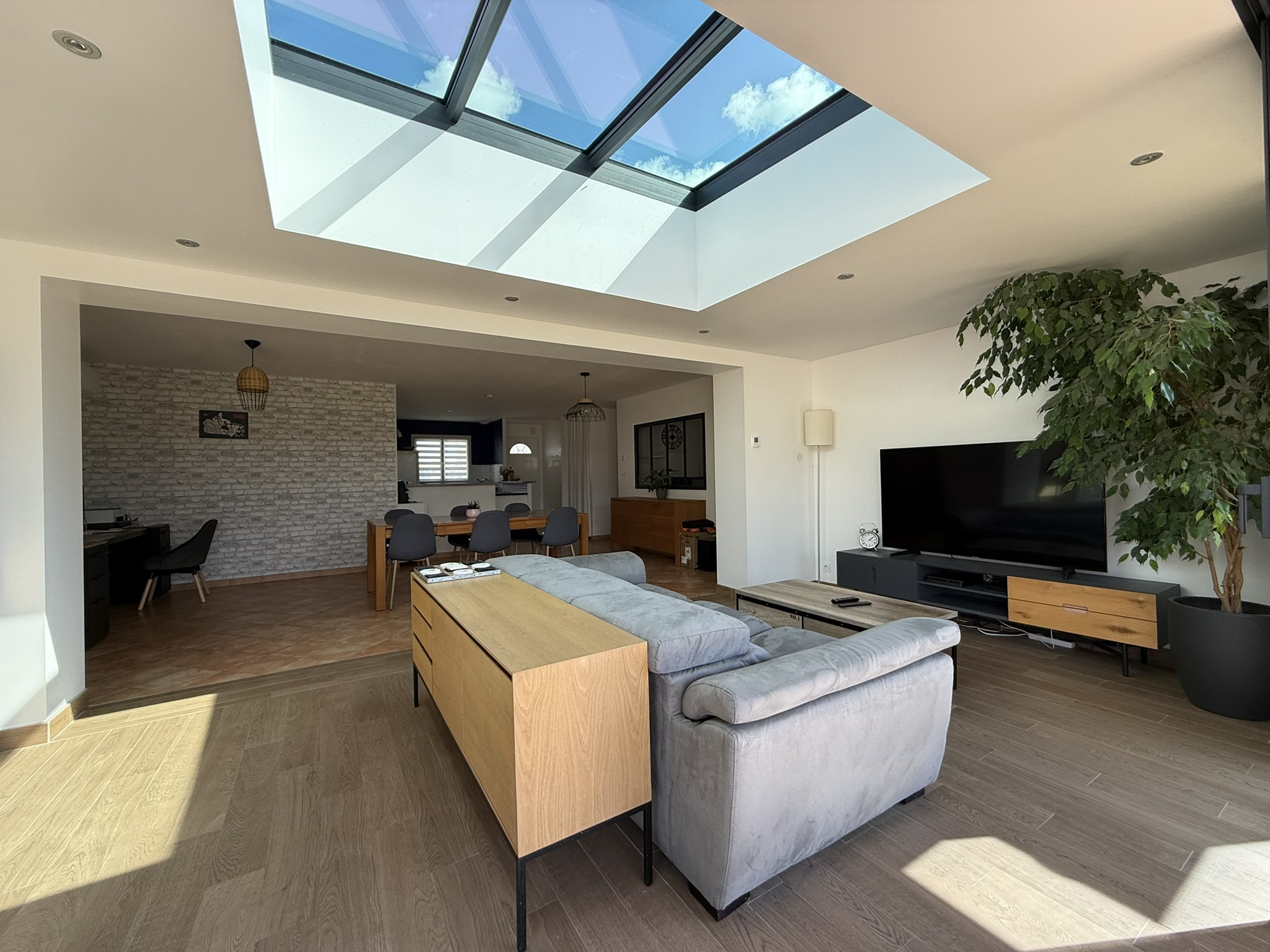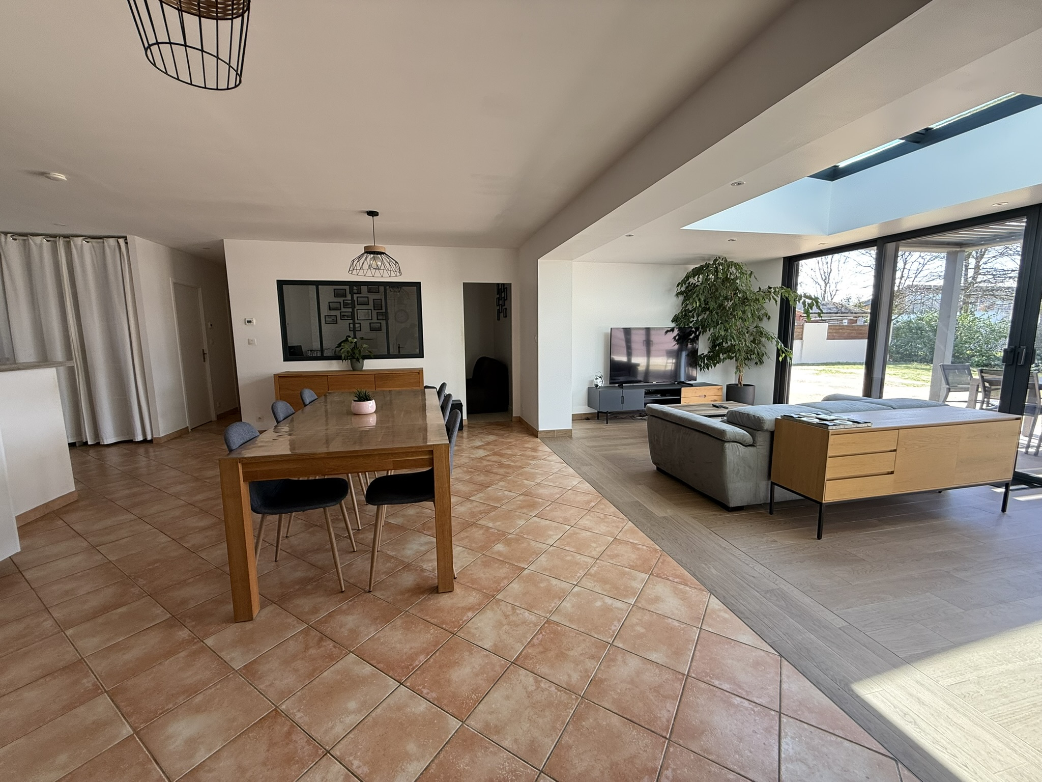 - un hall d'entrée avec placard, desservant un espace de vie (62,20m2) ultra lumineux et traversant exposition Sud-Ouest (extension moderne 'Concept alu' 2019 avec baie vitrée 4 vantaux de 5m20) équipé d'un système de climatisation.