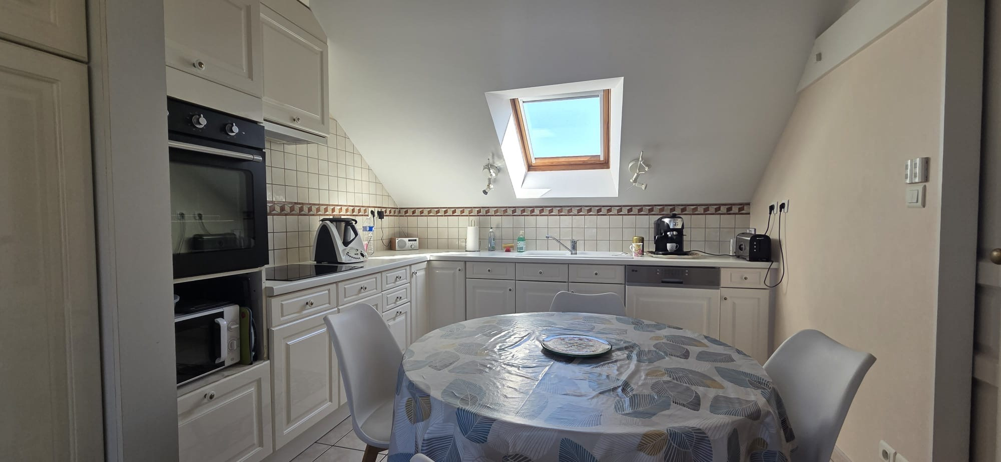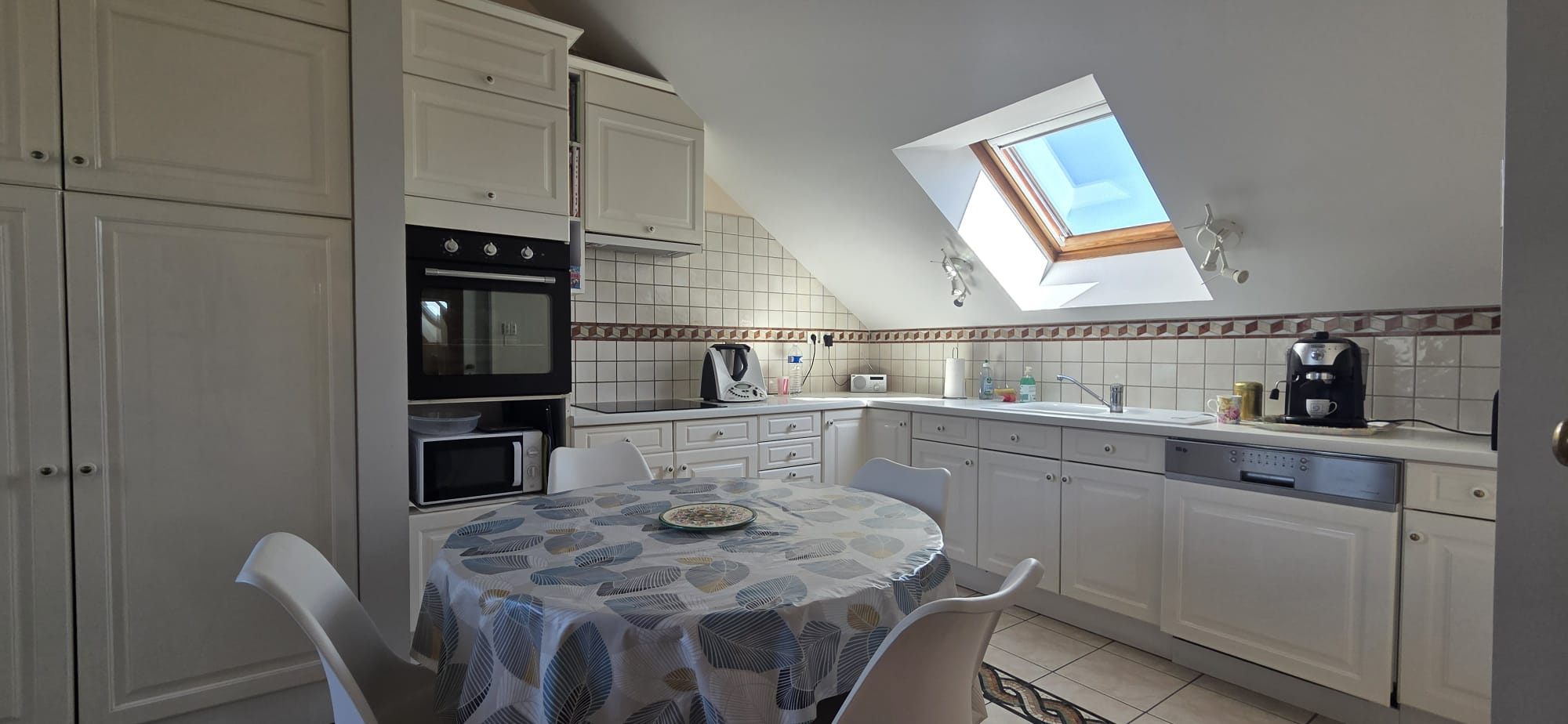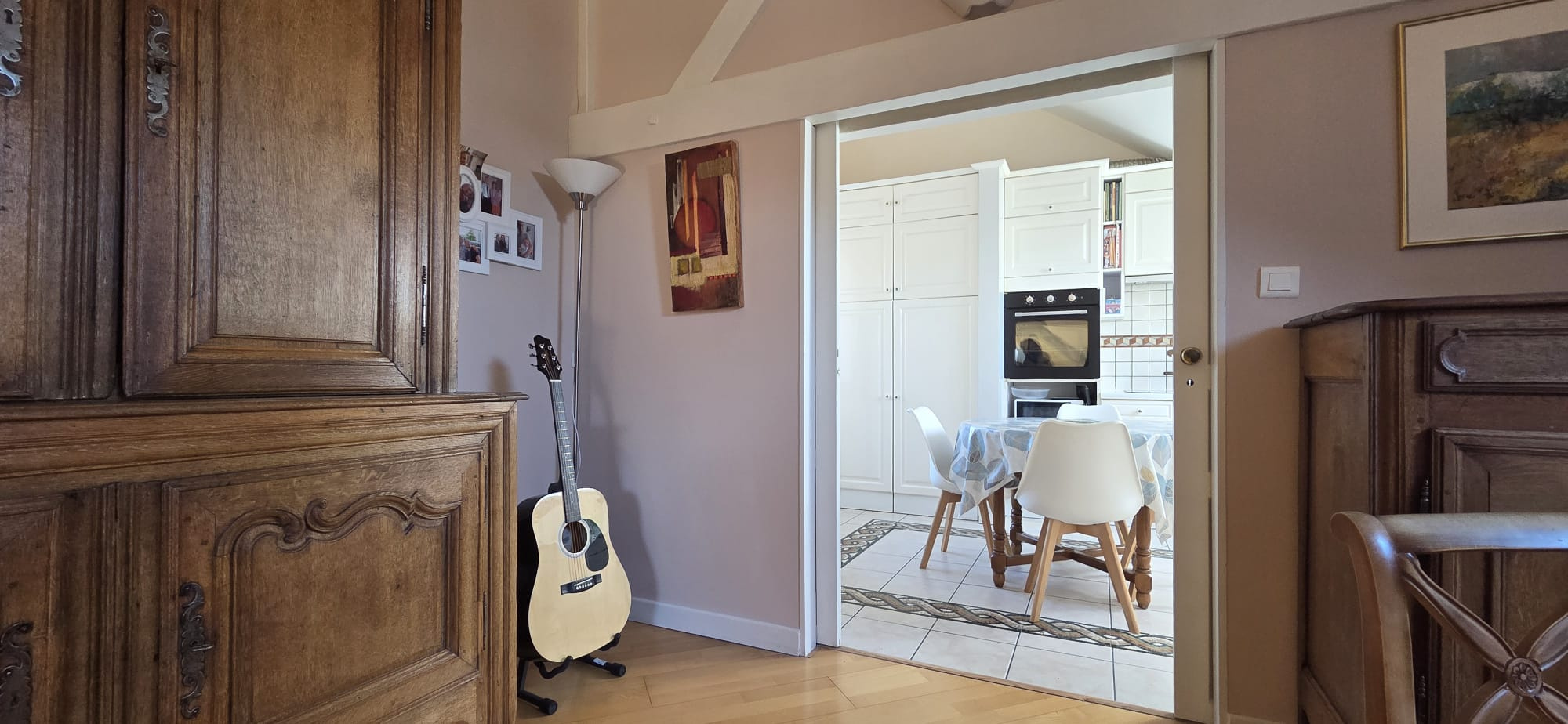 Le volume, exposé est/sud, baigne dans la lumière et offre une distribution à la fois fluide et cohérente. Depuis l'entrée, on accède à une pièce de vie de 33 m2 Carrez articulant naturellement un salon intime et un espace salle à manger, en lien direct avec la cuisine équipée.