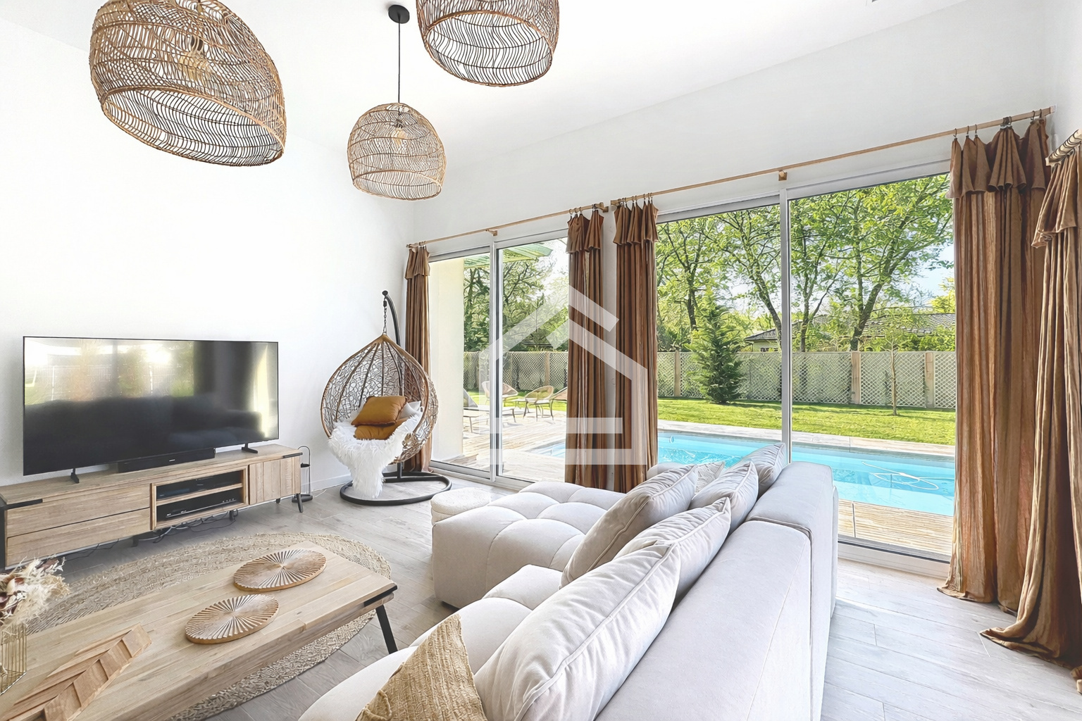 Dès l'entrée, vous serez séduits par la belle hauteur sous plafond et la luminosité de la vaste pièce de vie de 60 m2, ouverte sur l'extérieur et la piscine.