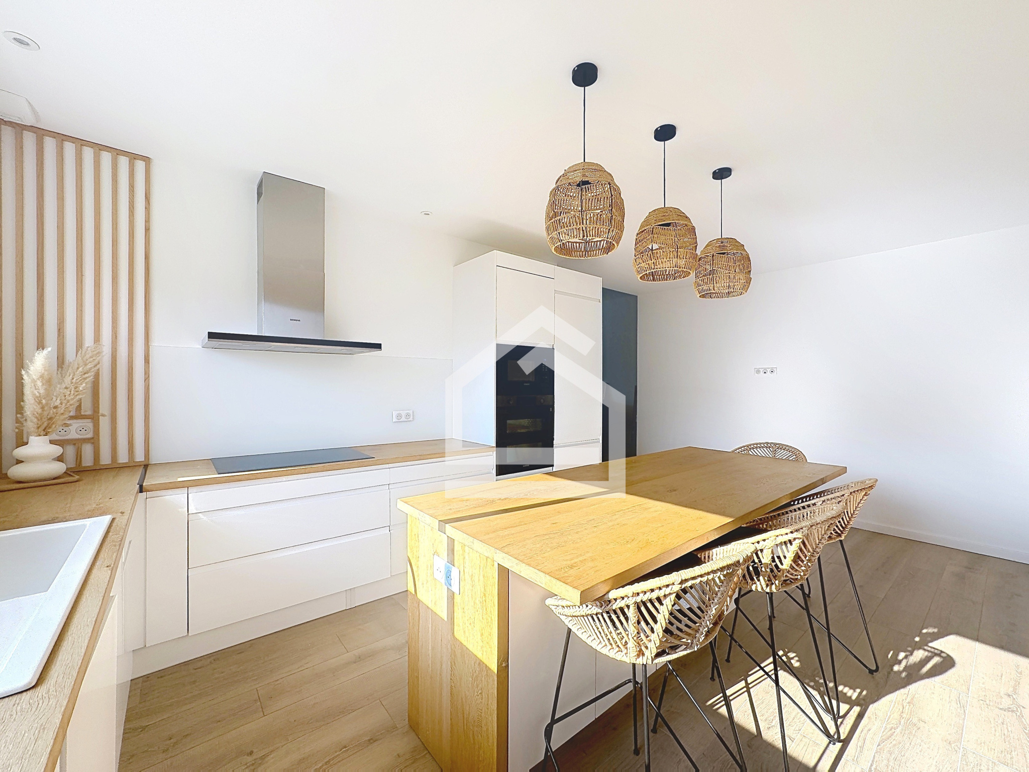 La cuisine de 22m2, semi-ouverte, aménagée et équipée, avec îlot central, est prolongée par une grande buanderie/cellier de 11m2.