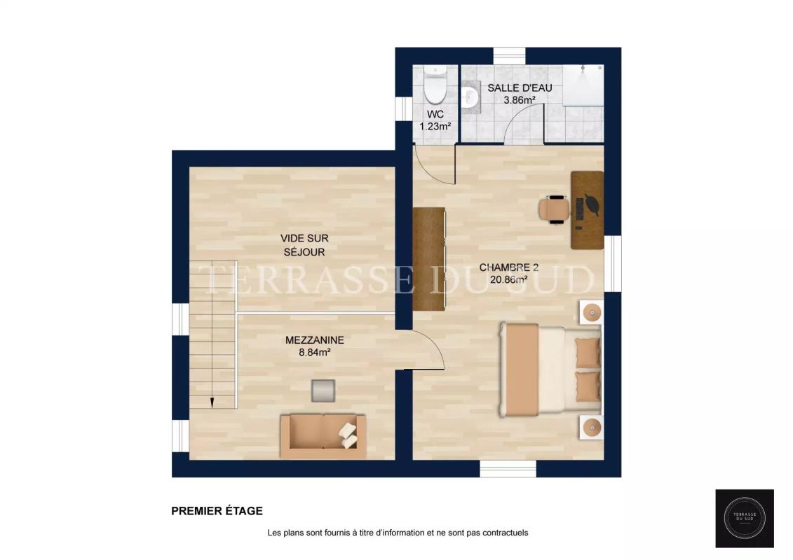 L'étage est composé d'une mezzanine, d'une vaste chambre de 20m², d'une salle de bain et d'un wc.