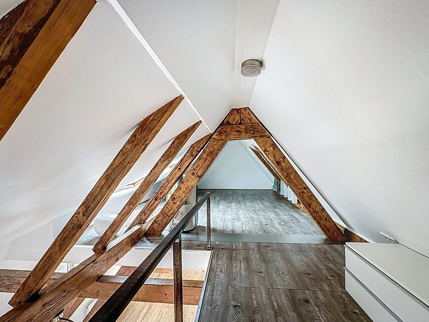 Sous les combles, un dégagement ouvert sur le séjour et une chambre, le tout sur 24 m² au sol.