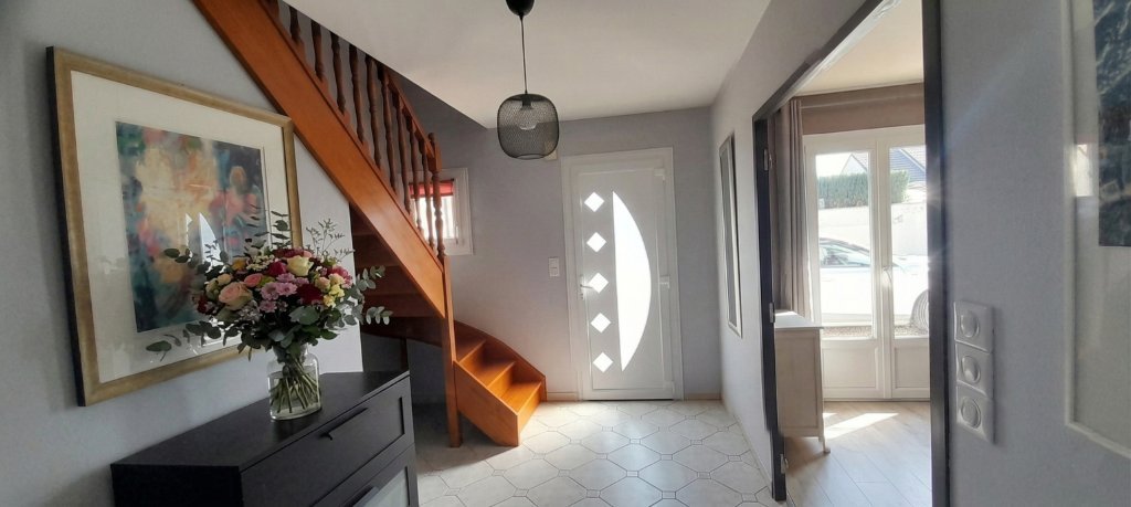En franchissant la porte, on ressent immédiatement la lumière et la fluidité des espaces. L'entrée, avec ses rangements, donne le ton d'une maison pratique et bien pensée, complétée par une buanderie et un garage attenant.