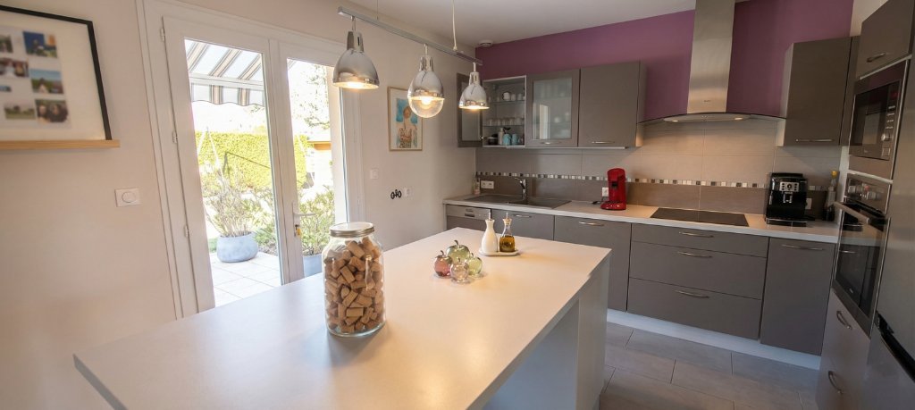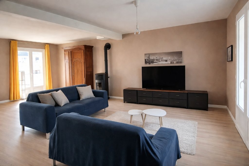 Puis la maison s'ouvre sur un espace de vie chaleureux. Le poêle à pellets crée une atmosphère douce en hiver, tandis que les larges ouvertures laissent entrer la lumière et prolongent naturellement les espaces vers le jardin. La cuisine équipée, ouverte sur la pièce de vie et avec un accès direct à la terrasse, s'intègre parfaitement à l'ensemble et constitue un lieu central, à la fois fonctionnel et agréable à vivre.