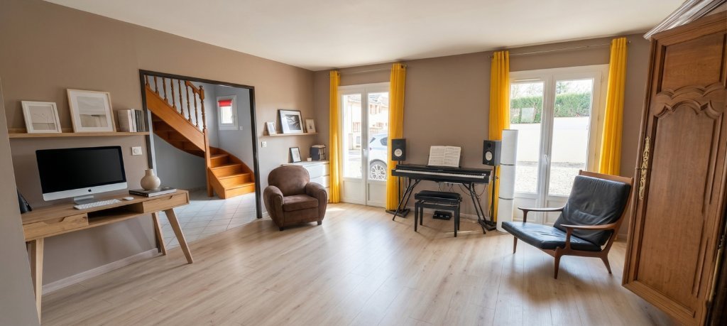Le rez-de-chaussée offre un véritable confort de vie de plain-pied, avec notamment une grande pièce actuellement aménagée en bureau, idéale pour le télétravail ou facilement transformable en chambre selon vos besoins.