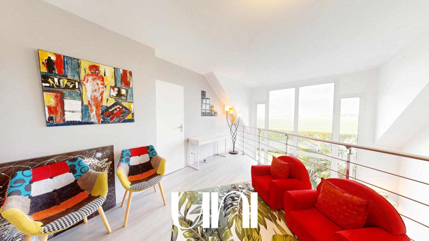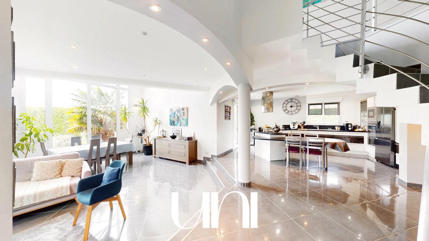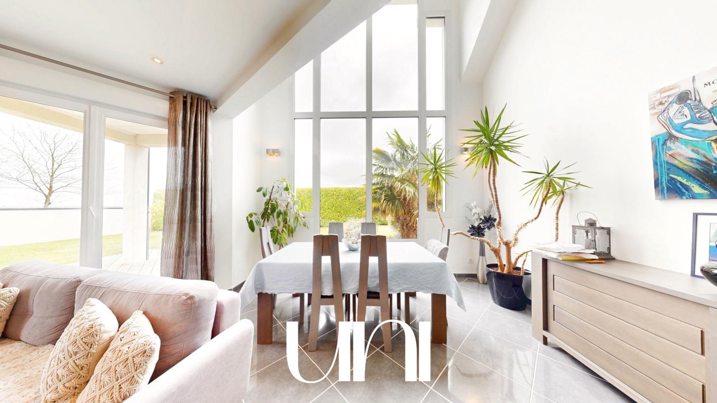 Dès l'entrée, les volumes impressionnent : les espaces de vie ouverts, baignés de lumière naturelle, créent une atmosphère chaleureuse et résolument moderne. L'architecture, à la fois élégante et originale, est sublimée par une grande baie vitrée qui agit comme un véritable puits de lumière, mettant en valeur chaque espace tout au long de la journée.