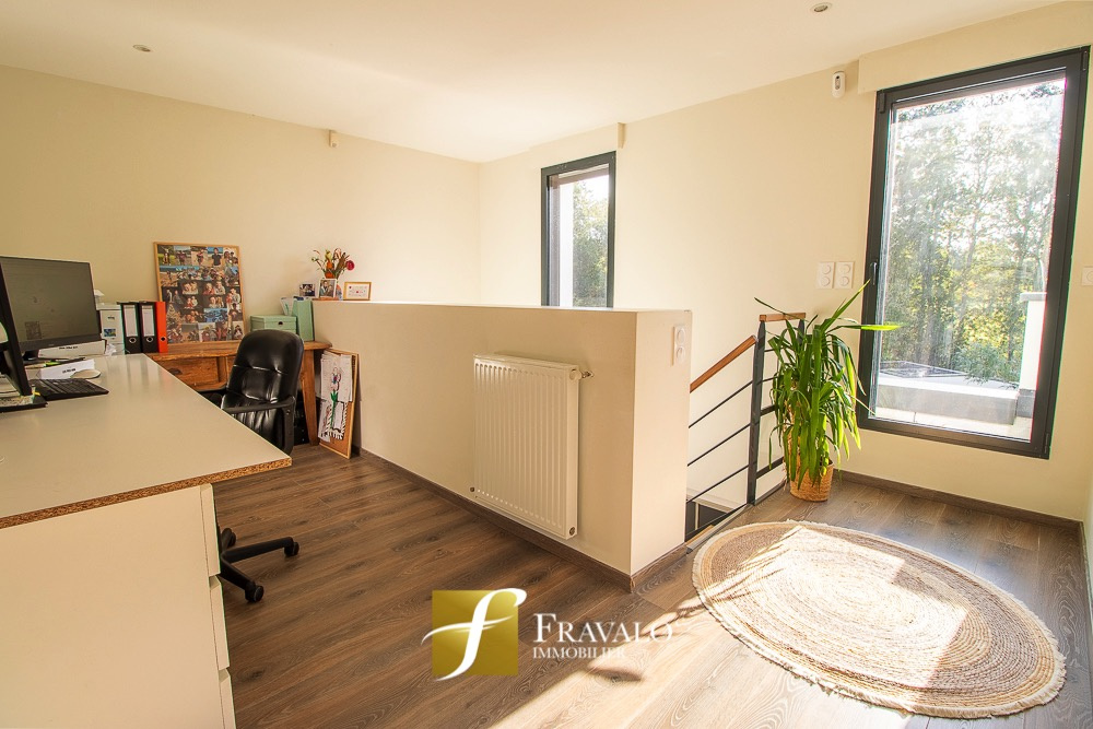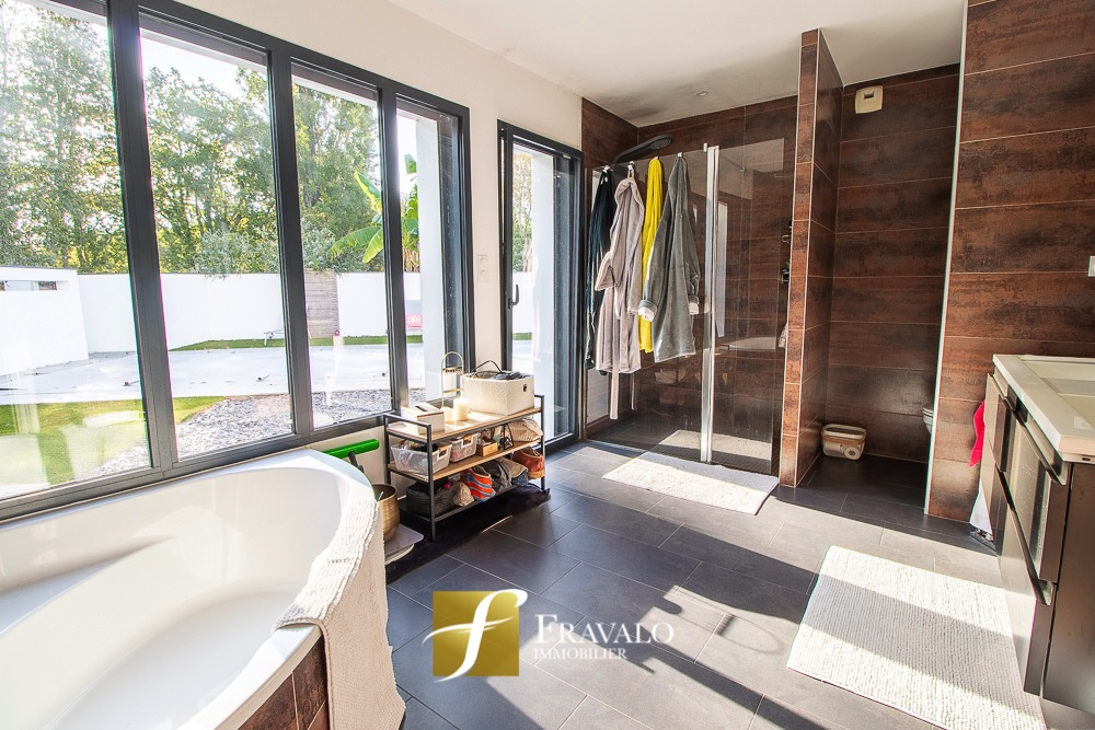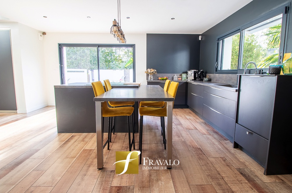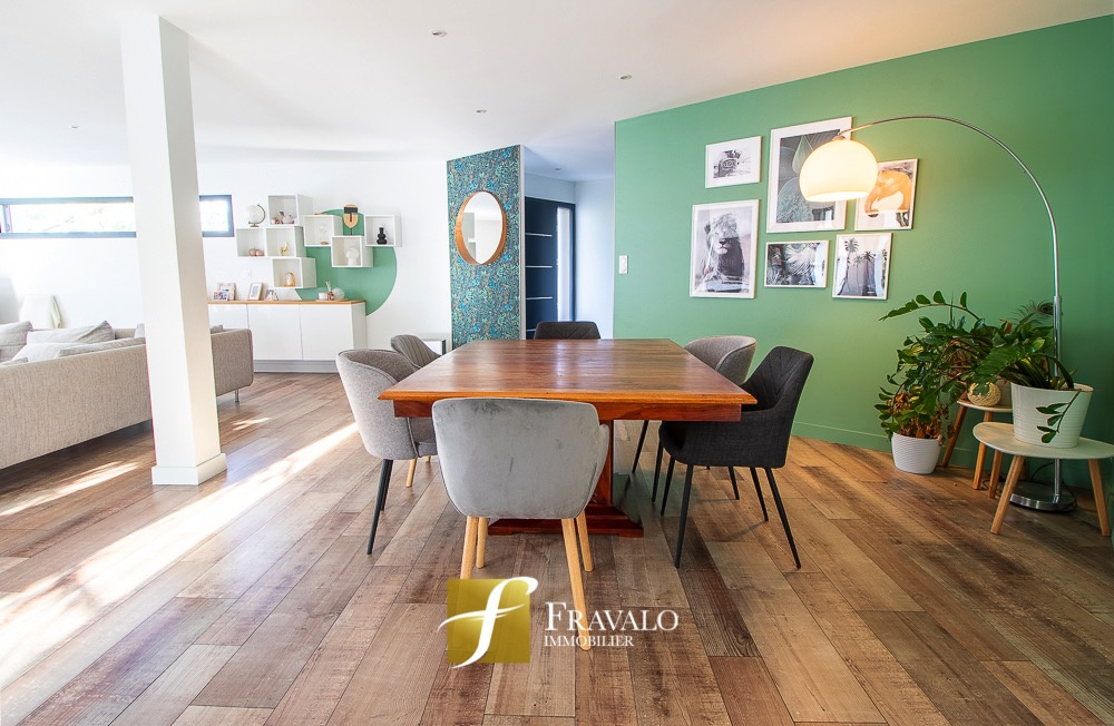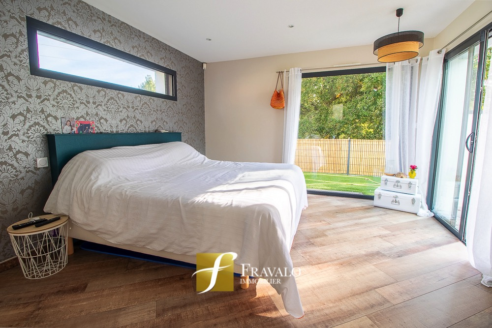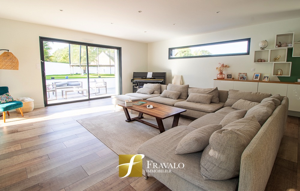EXCLUSIVITE - A seulement 10 minutes de Vannes, découvrez cette superbe maison contemporaine de 2015 aux beaux volumes, située dans un environnement sans vis-à-vis. Au rez-de-chaussée, vous trouverez une entrée desservant un vaste et lumineux séjour ouvert sur une cuisine aménagée-équipée, offrant un espace de vie d'environ 90 m2. Une suite parentale avec salle de bains/douche/wc, un wc, une buanderie ainsi qu'un garage aménagé en bar et espace de rangement complètent ce niveau. A l'étage, une mezzanine dessert trois chambres spacieuses et lumineuses, une salle de jeux, une salle de bains ainsi qu'un wc séparé. Le tout est édifié sur un terrain clos de près de 1500 m2 agrémentée d'un carport, d'un local technique et d'une belle piscine. Estimation des coûts annuels d'énergie pour un usage standard du logement: entre 890 EUR et 1260 EUR (abonnement compris). Les informations sur les risques auxquels ce bien est exposé sont disponibles sur le site Géorisques : georisques.gouv.fr