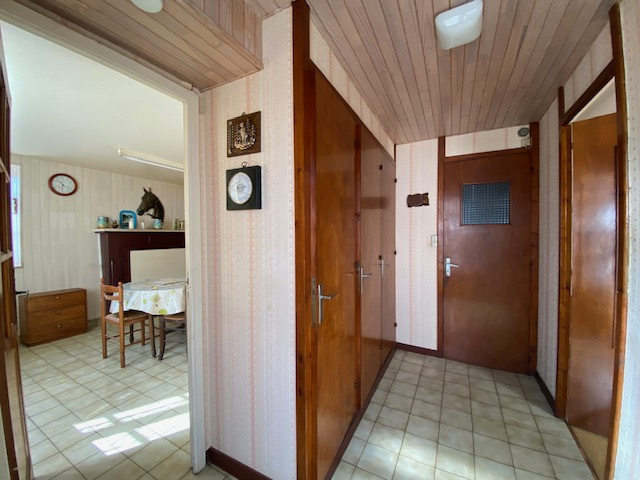 Maison + Terrain à bâtir à vendre à GUELTAS (56920), composée : au rez-de-chaussée : entrée avec placard/penderie (6,12 m2), cuisine avec cheminée (15,45 m2), dégagement (3 m2), salle de douche à l'italienne/wc (5 m2), séjour/salon avec cheminée (20,80 m2) ; à l'étage : palier (1,91 m2), une chambre (18,76 m2), wc (1,50 m2), salle de bains (4 m2), une chambre (20 m2) ;