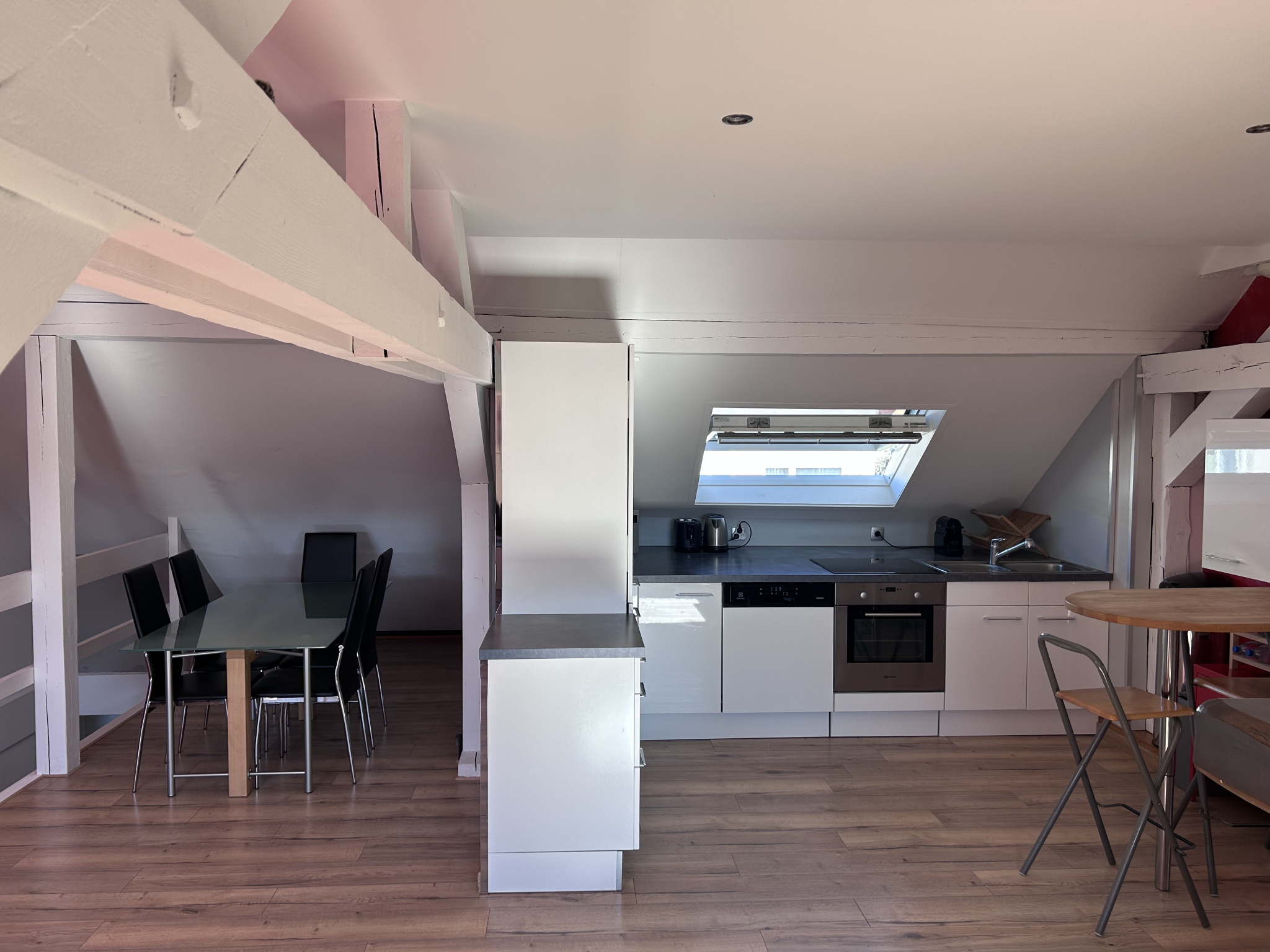 Mulhouse, charmant 3 pièces de 80m2 situé au 2eme et dernier étage d'une maison aménagée en copropriété de 4 logements, grande pièce à vivre avec cheminée et poûtres, cuisine équipée moderne, parquet neuf, 2 chambres, un balcon, très calme et lumineux, une cave et un parking.