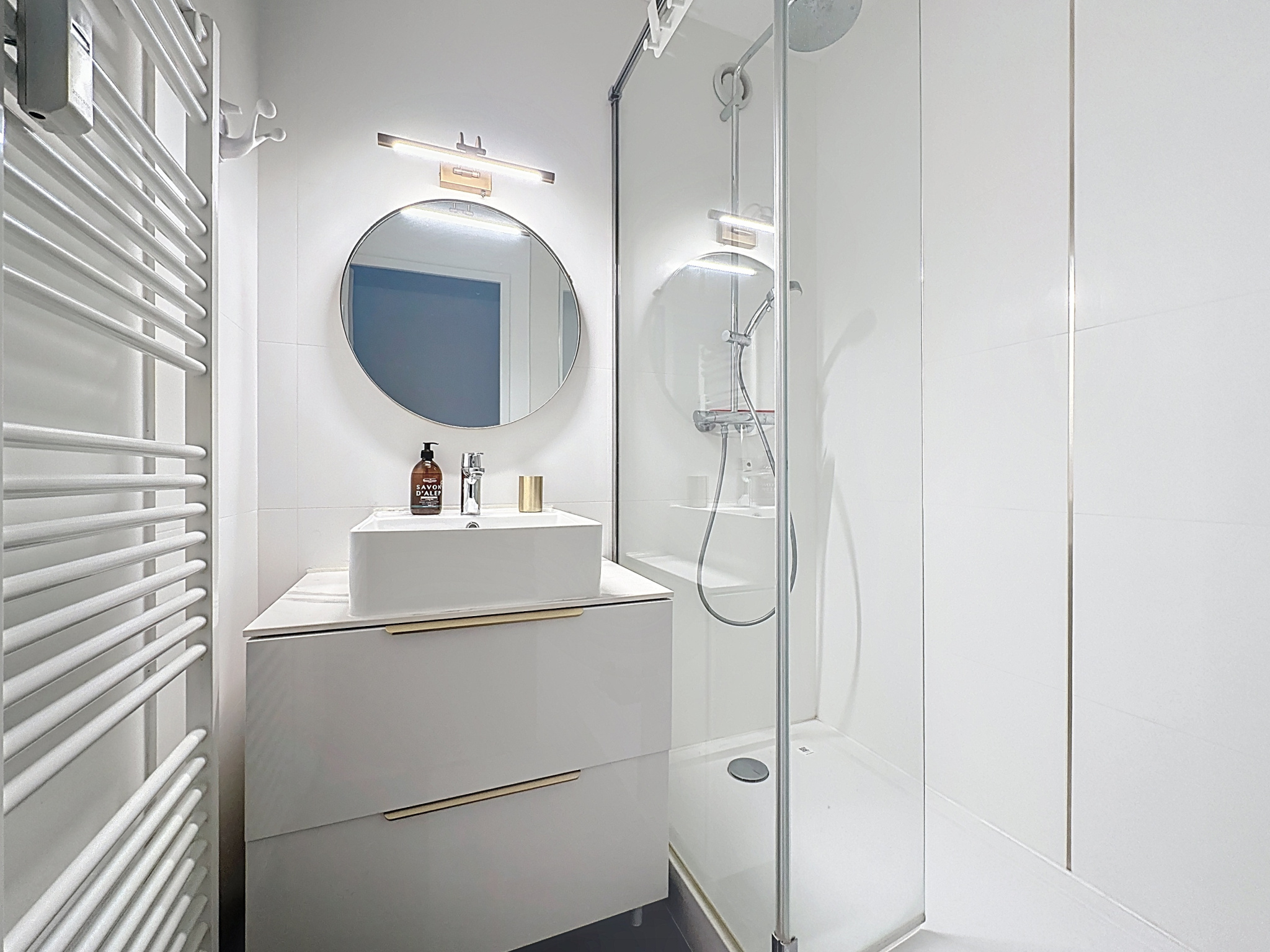 Le bien se compose comme suit : une vaste et lumineuse pièce de vie traversante de 37.55 m2 disposant de rangements sur-mesure, une cuisine aménagée et équipée (CUISINELLA), un dégagement avec rangements desservant trois chambres (avec placards) dont deux avec vue sur le parc de la copropriété, une salle de douches, une salle de bains et des WC indépendants.