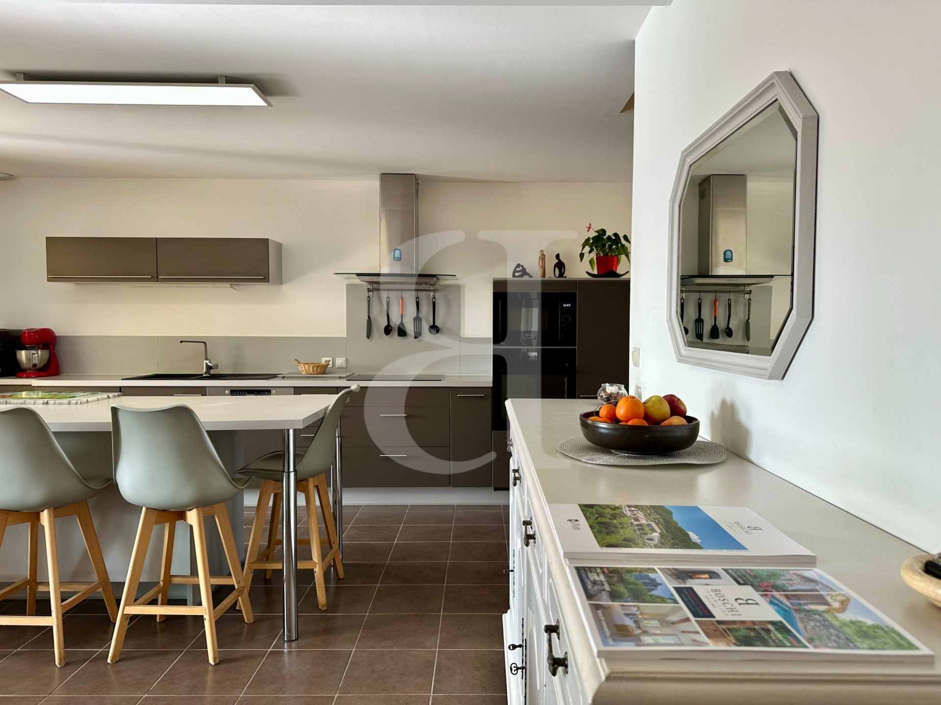 Cet espace lumineux s'ouvre sur une terrasse couverte exposée plein sud, vous permettant de profiter de repas à l'extérieur toute l'année.