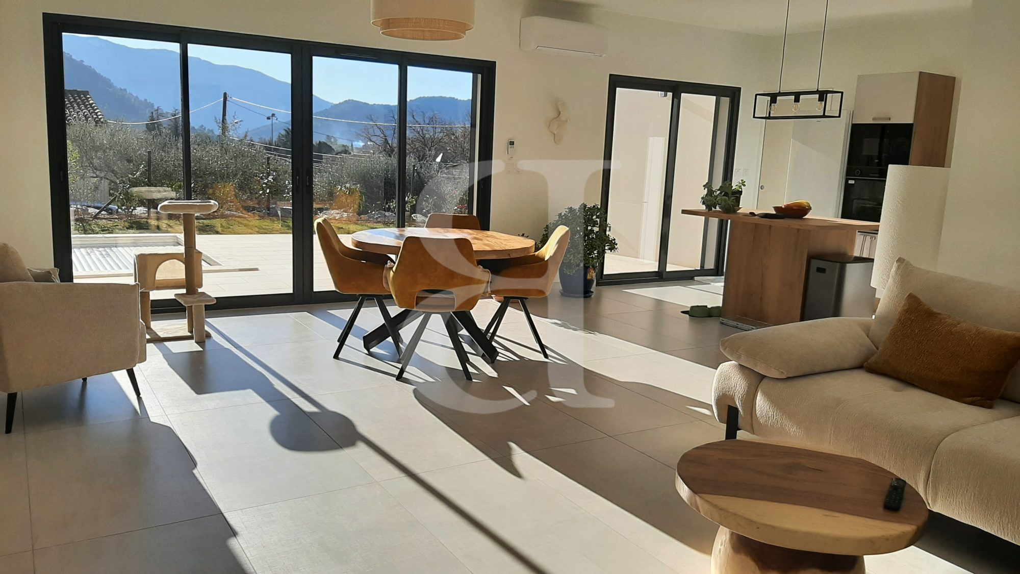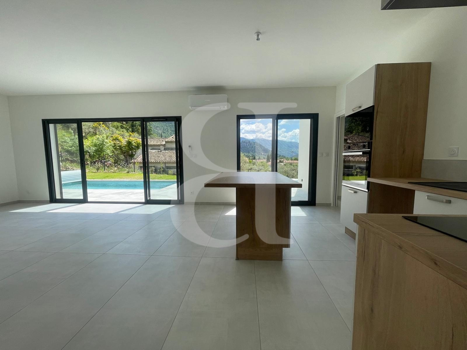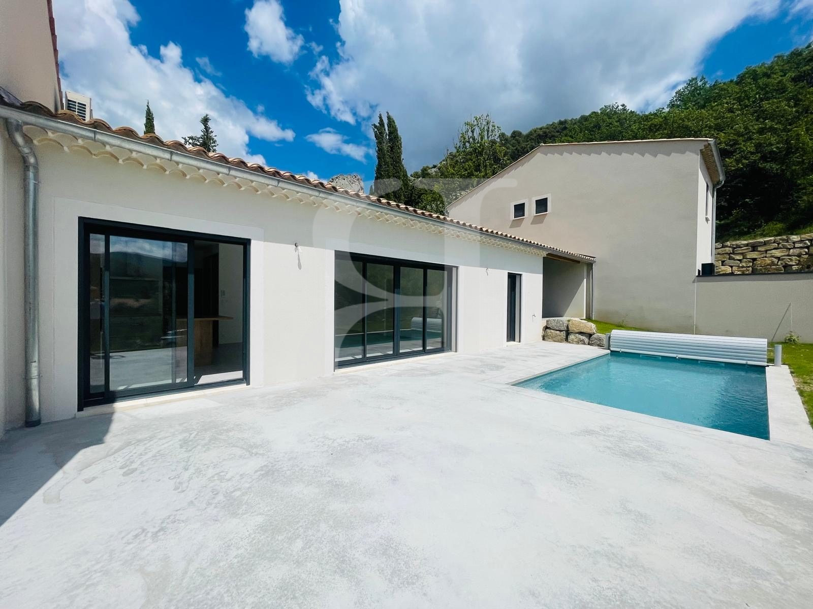 A proximité immédiate du joli centre du village de Buis-les-Baronnies et de ses commerces, nous vous proposons de découvrir cette superbe villa récente construite dans un esprit contemporain avec piscine et grand garage. La villa offre 133 m², elle est composée d'un vaste espace de vie lumineux ouvert sur la piscine, d'une cuisine équipée avec son îlot central et d'une suite parentale avec dressing, salle d'eau et WC donnant sur le bel extérieur. A l'étage, vous trouverez 2 belles chambres avec dressing, salle d'eau et WC séparé. Vous apprécierez les prestations haut de gamme de ce bien ainsi que ses matériaux de qualité. La maison bénéficie d'une jolie vue sur le Saint-Julien et d'une exposition au sud. Une mitoyenneté est présente et ce fait par un auvent pour une voiture. La villa est équipée de climatisation réversible.