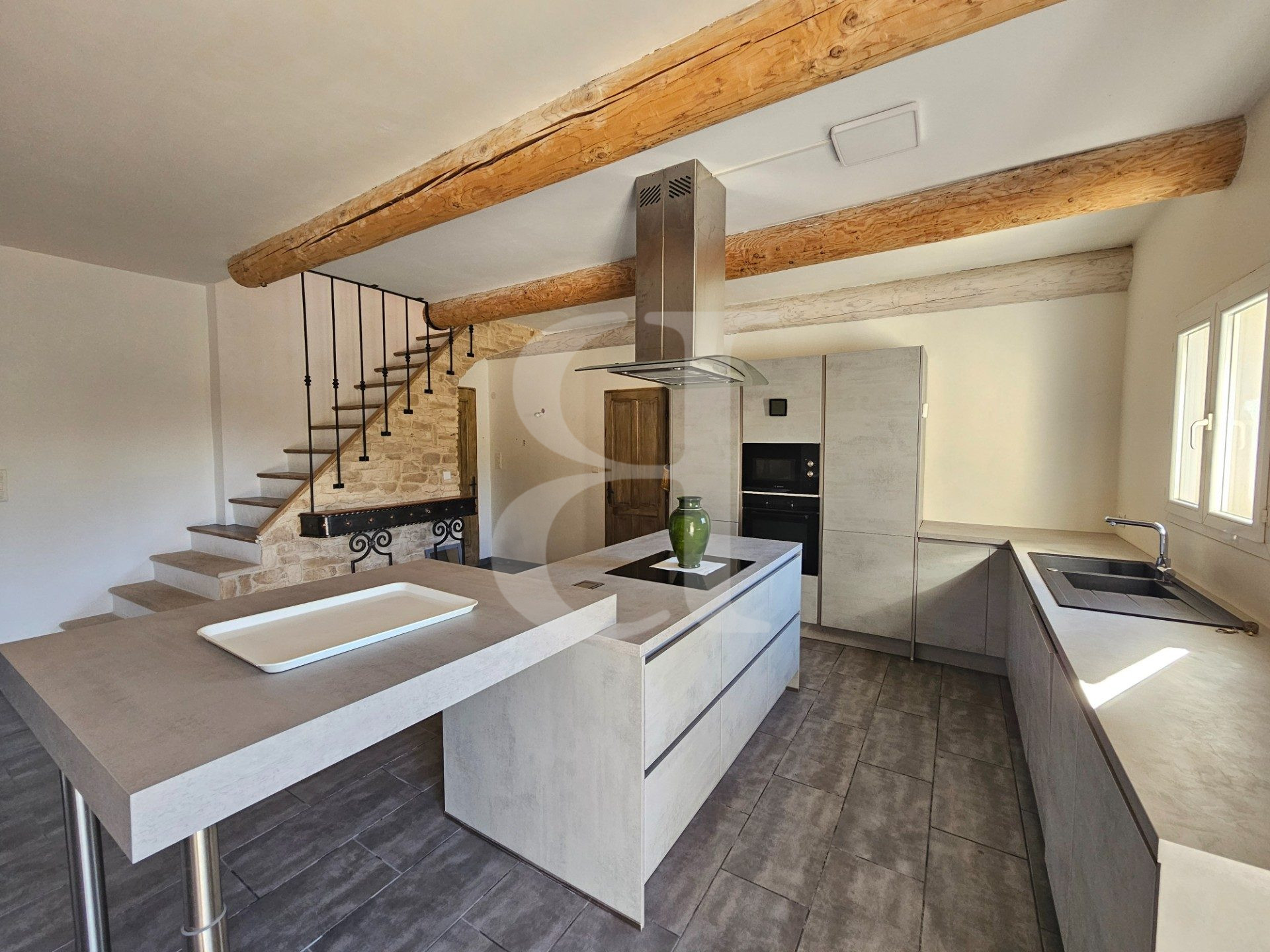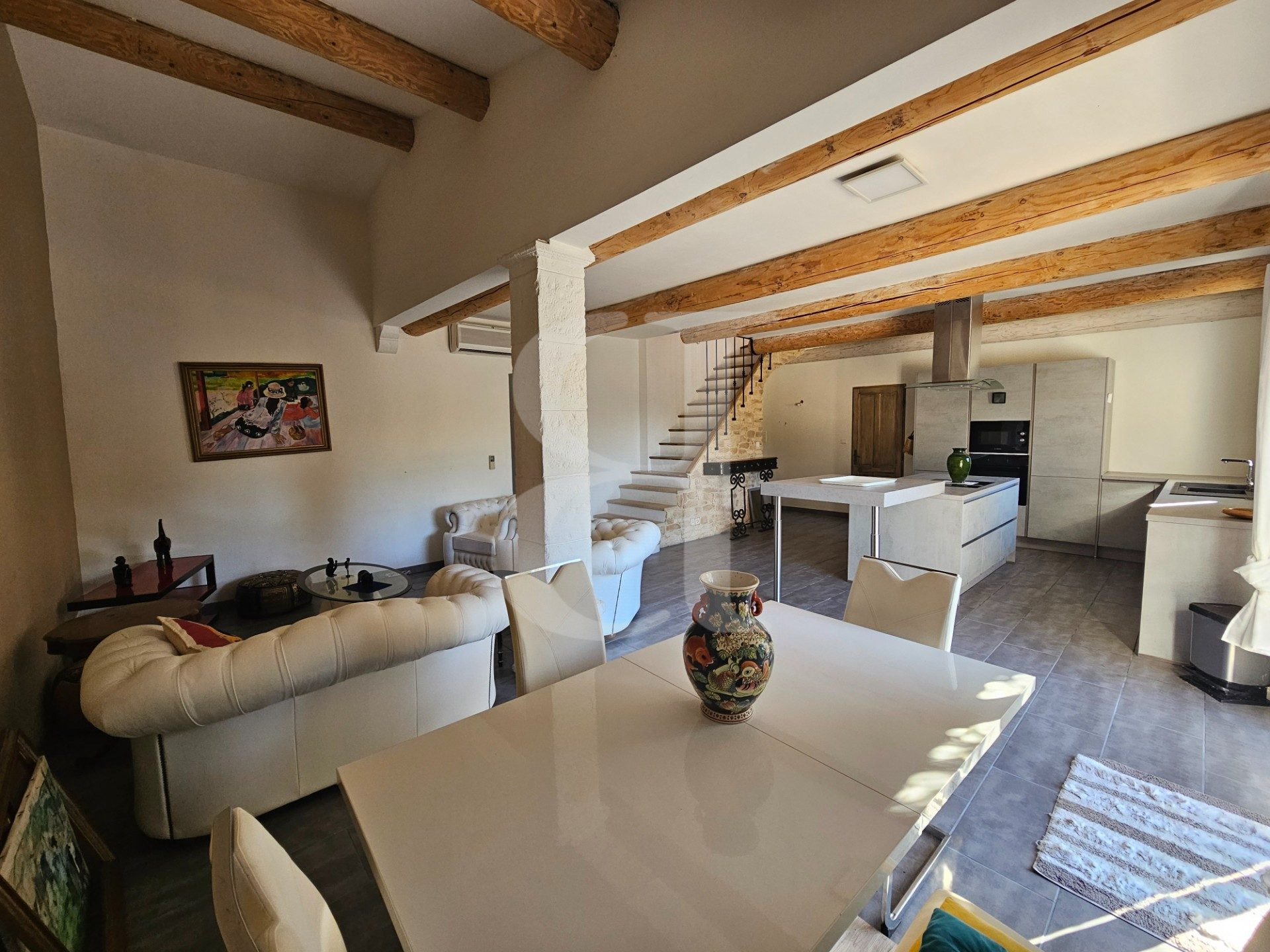 D'une surface d'un peu plus de 100 m², elle se compose en rez-de-chaussée d'une chambre spacieuse, d'une salle de bain, d'un grand séjour lumineux de plus de 50 m² avec de superbes poutres apparentes, ainsi que d'une cuisine ouverte (ou à préciser selon le cas).