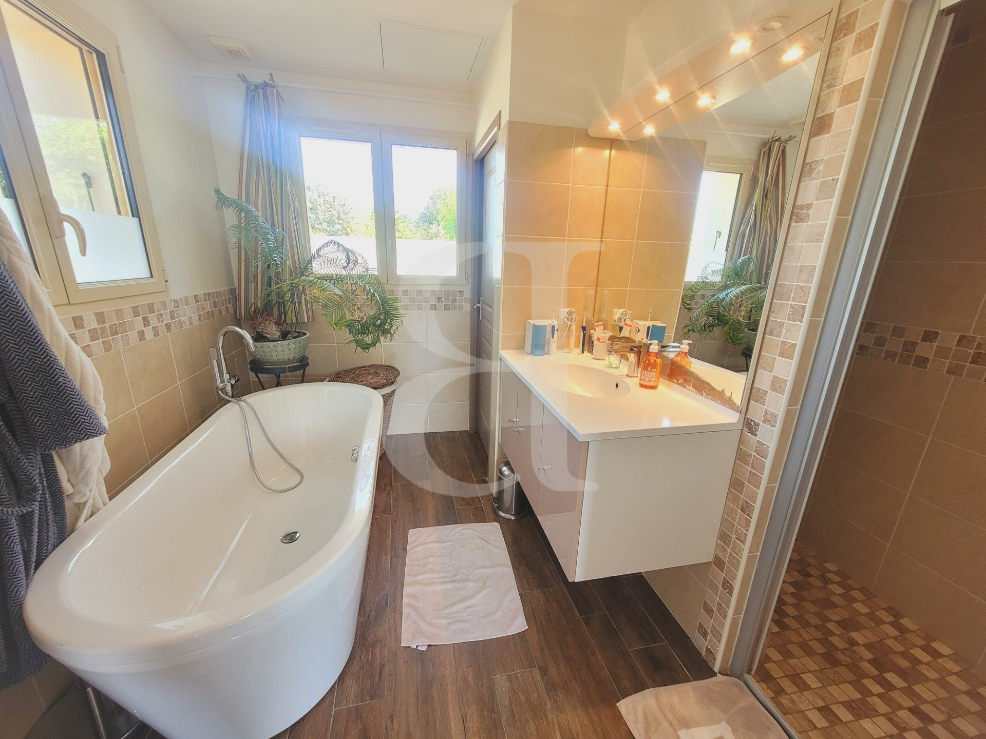 Elle dispose de 4 chambres lumineuses, dont une en rez-de-chaussée, et 3 salles d'eau élégantes et fonctionnelles. La suite parentale, à l'étage, bénéficie de sa propre terrasse privative, idéale pour se délasser en toute quiétude, face aux collines. Un bureau aménagé dans l'ancien pigeonnier, charmant et inspirant, sera parfait pour le télétravail ou la création.