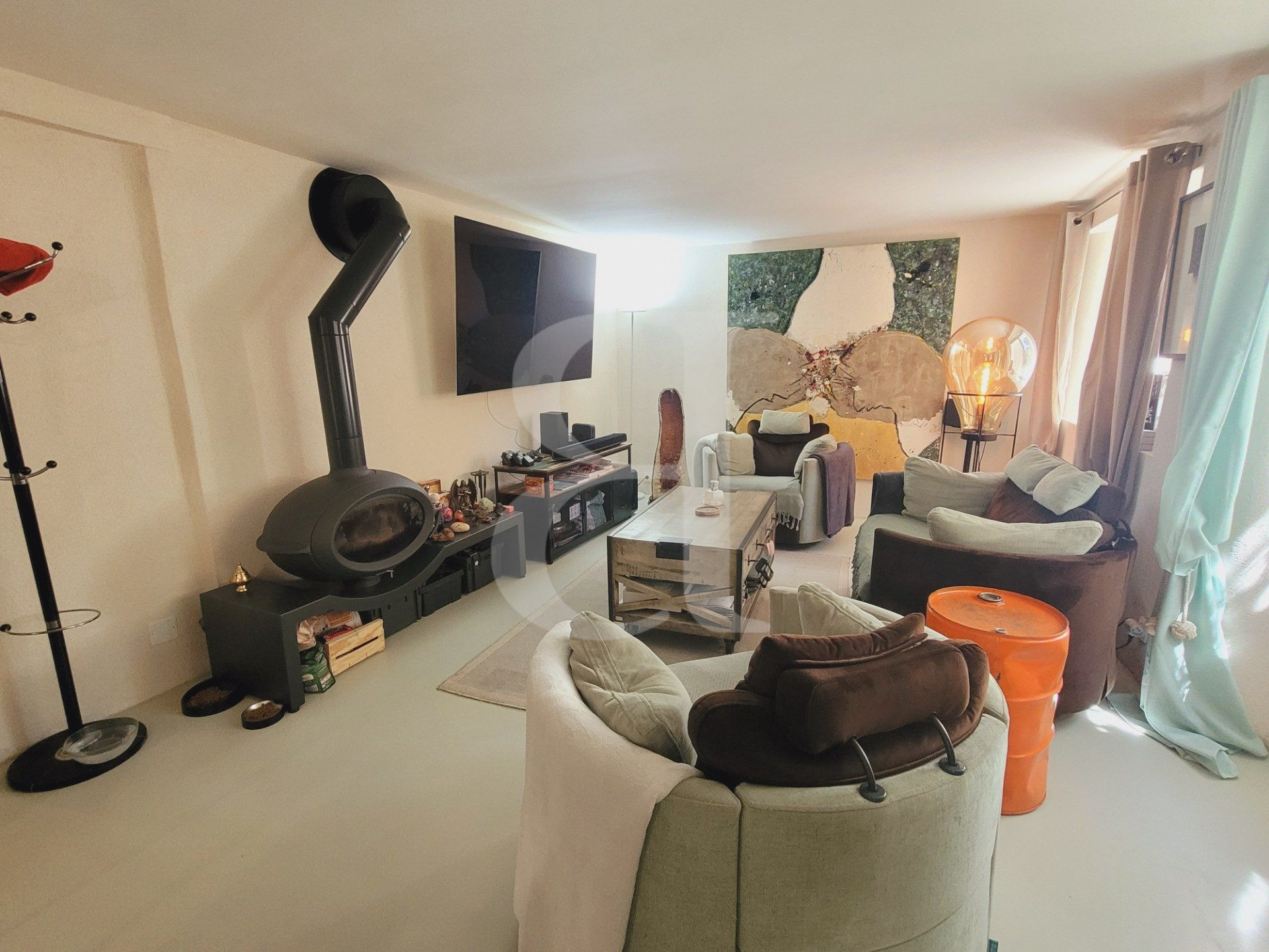 Pièce à vivre de 45,50 m2 avec cuisine équipée ouverte sur Salon séjour avec poêle à bois contemporain