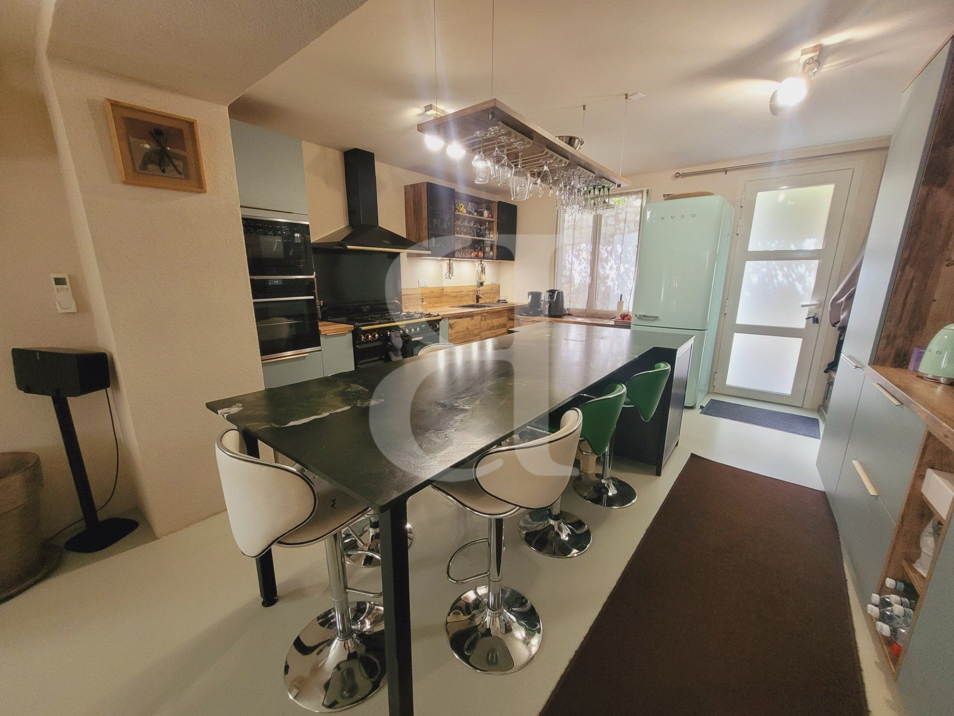 Les volumes ont été repensés avec intelligence, la décoration soignée, les matériaux haut de gamme choisis avec soin : marbre du Brésil en cuisine, enduits naturels, poêle à bois contemporain...