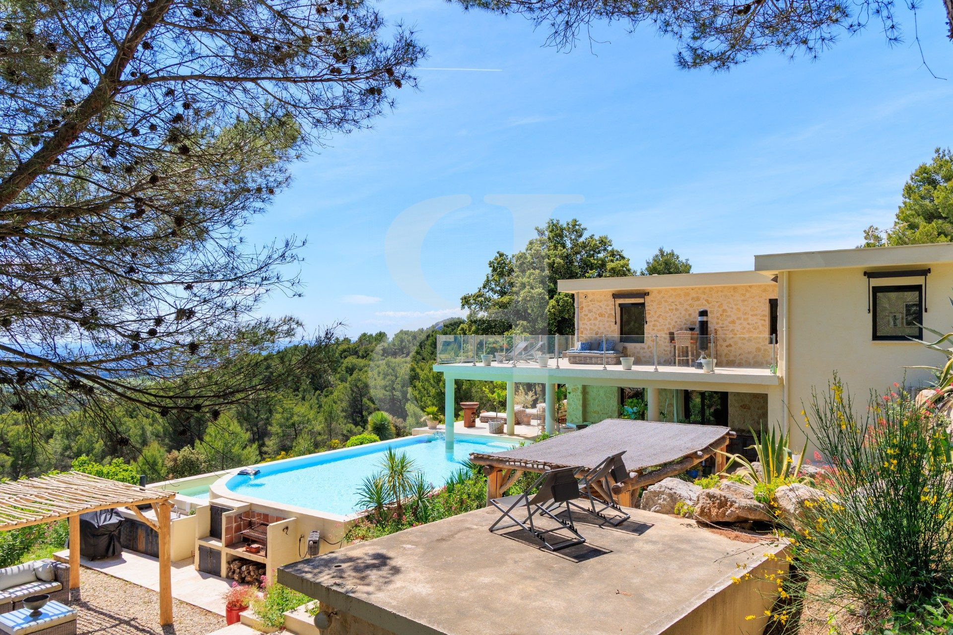 Situation exceptionnelle !! Lumineuse et confortable maison contemporaine d'environ 435m² implanté sur les hauteurs sur 15ha environ au milieu des pins de la garrigue et de ses essences provençales ! Offrant une pièce de vie de 140m² environ ouvert sur la terrasse et offrant un panorama imprenable des Monts de Vaucluse jusqu'à la vallée du Rhône en passant par les Alpilles ! Prestations de grande qualité. 6 chambres dont 4 suites avec une de 80m² environ. Piscine à débordement qui s'invite sous la terrasse pour en profiter à tout moment ! En un seul mot : Unique !