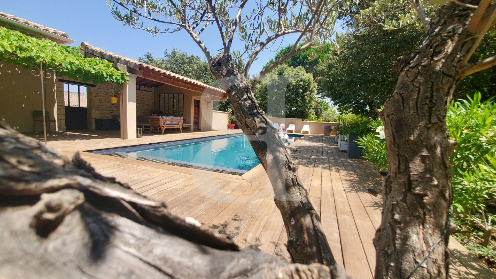 Située dans un environnement paisible, cette spacieuse villa de plain pied offrant 175m², avec une magnifique piscine offre un cadre de vie idéal avec de nombreux espaces extérieurs aménagés : spacieuse terrasse avec pergola, un espace salon couvert au bord de la piscine et un terrain ombragé de pins et de chênes entièrement clos de 1600 m².