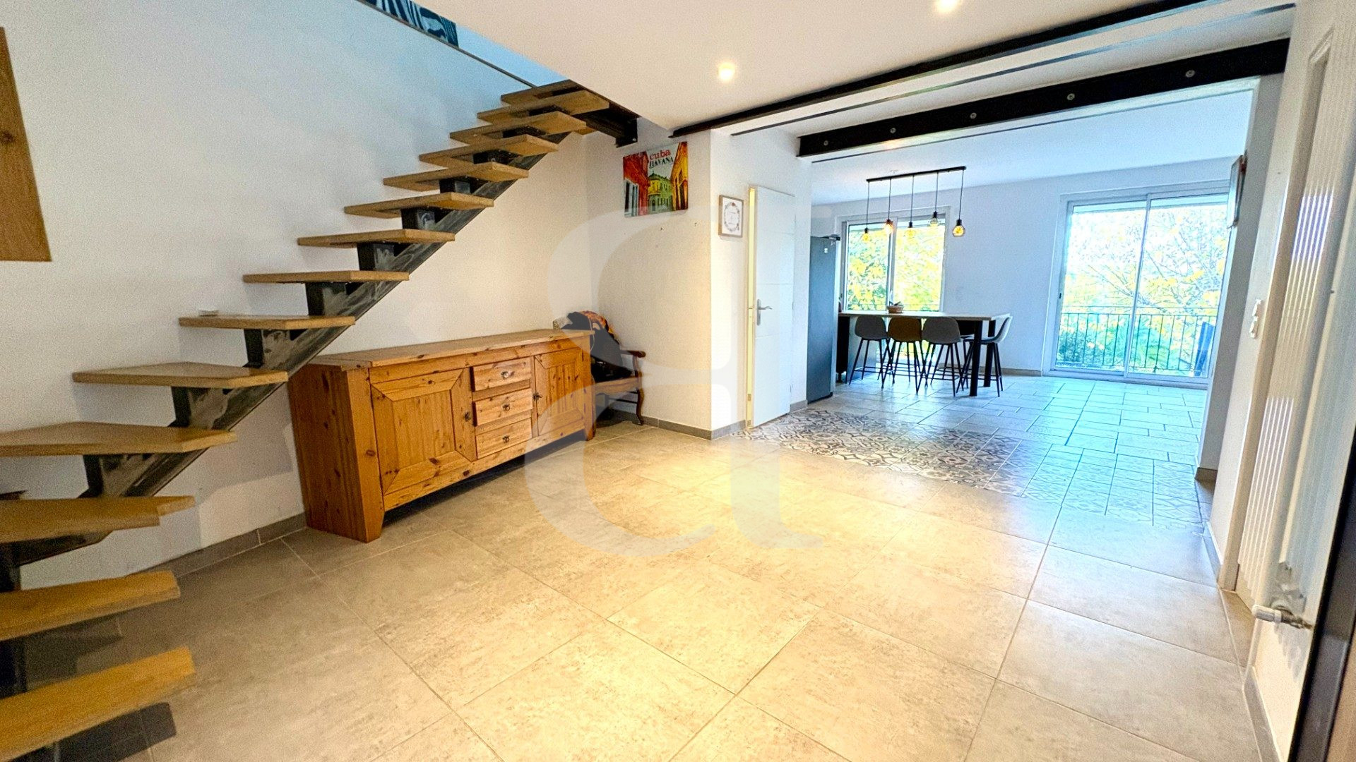 Entrée avec placard, salle à manger, salon, cuisine équipée avec poêle à bois 52 m²et accès terrasse