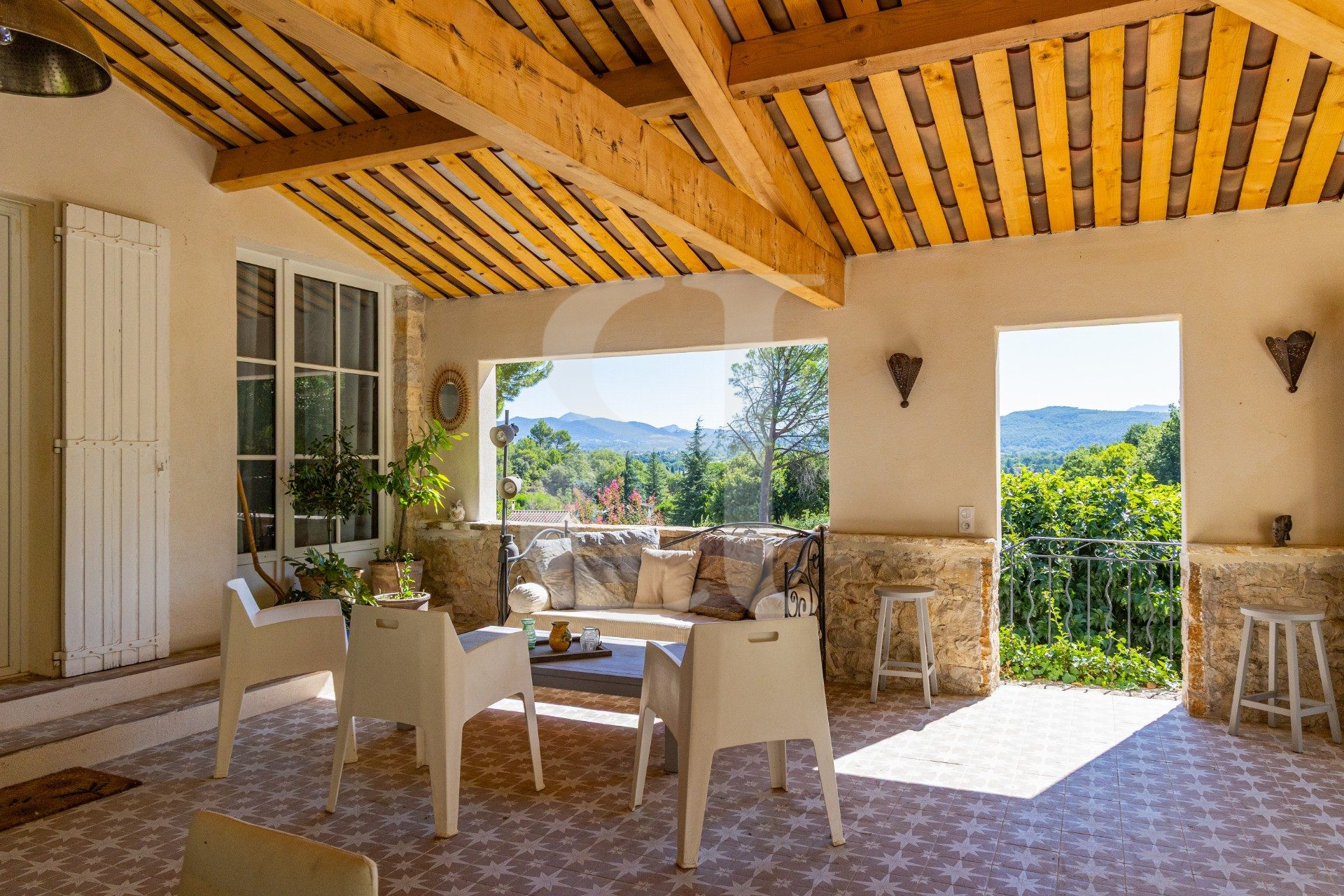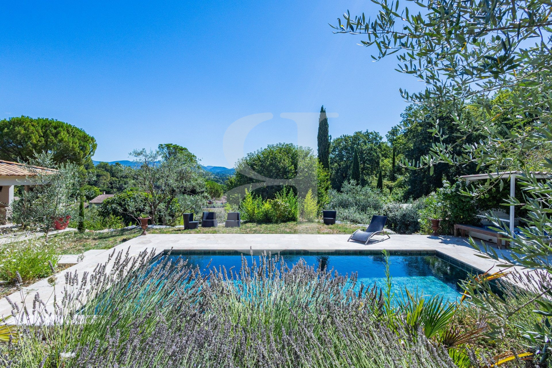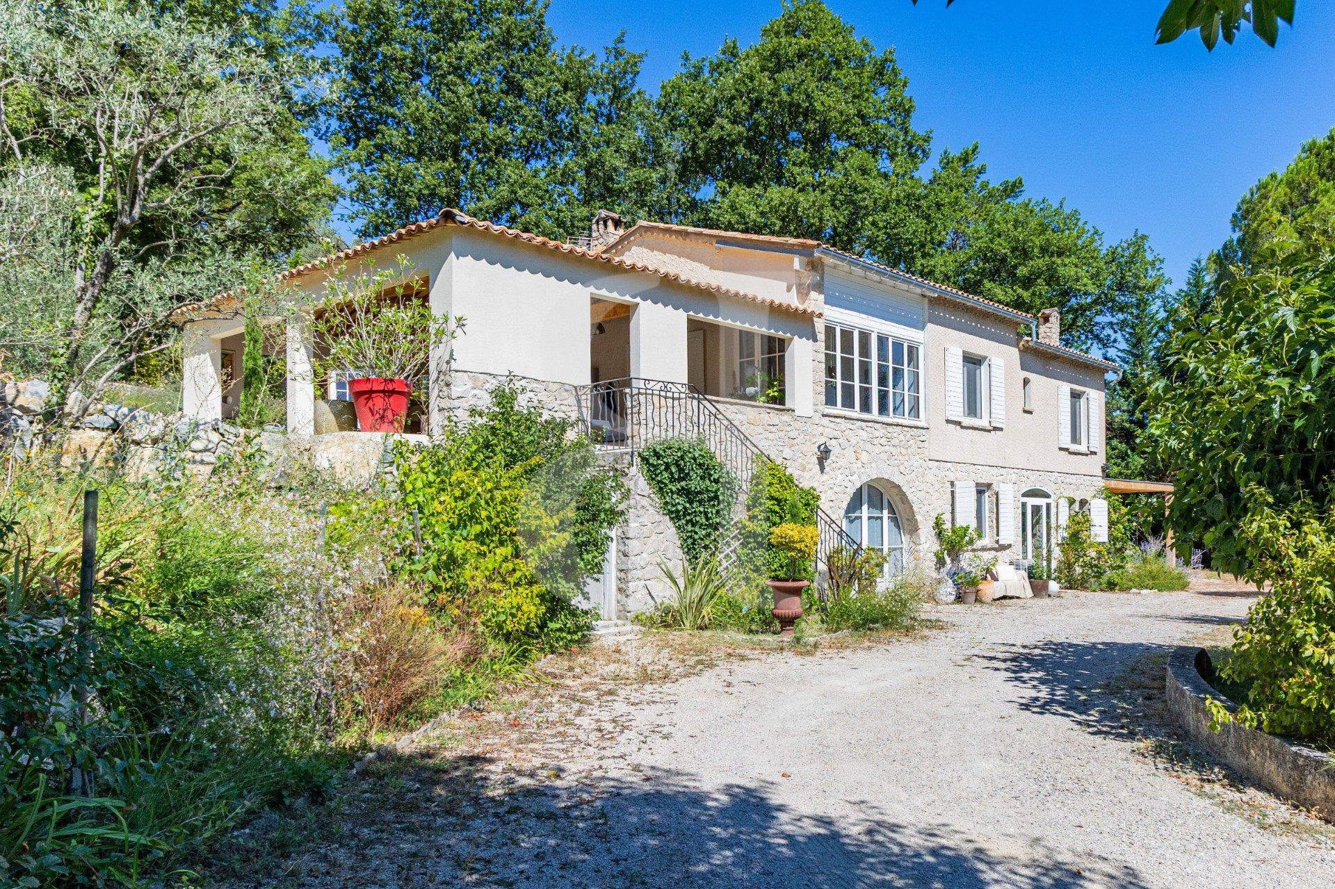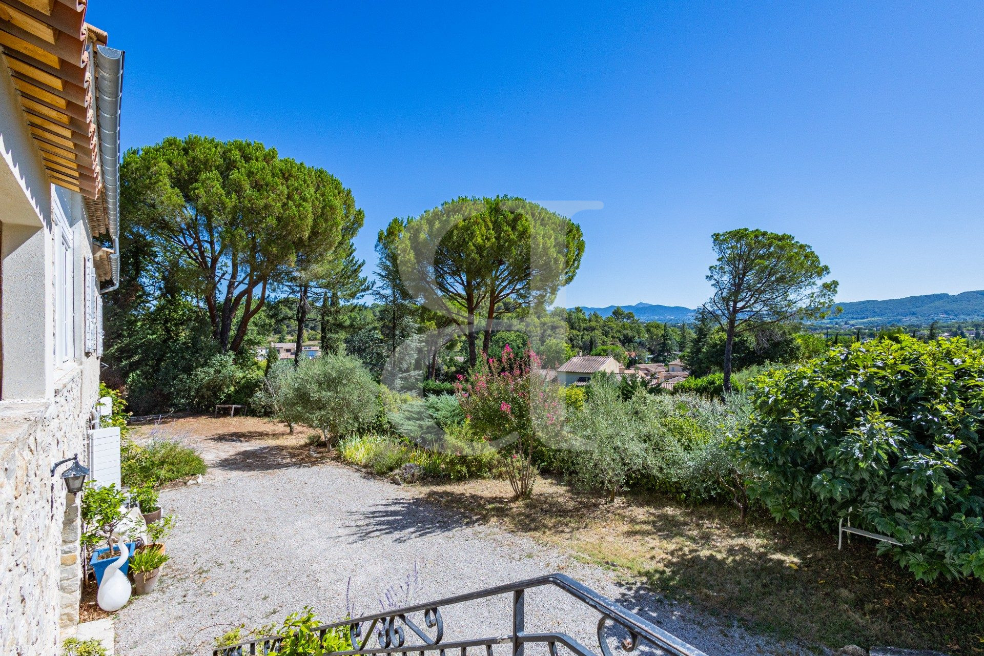 Implantée sur un terrain arboré d'environ 3 000 m², cette propriété offre un cadre de vie rare, entre nature, intimité et panorama exceptionnel sur les collines et le Mont Ventoux.