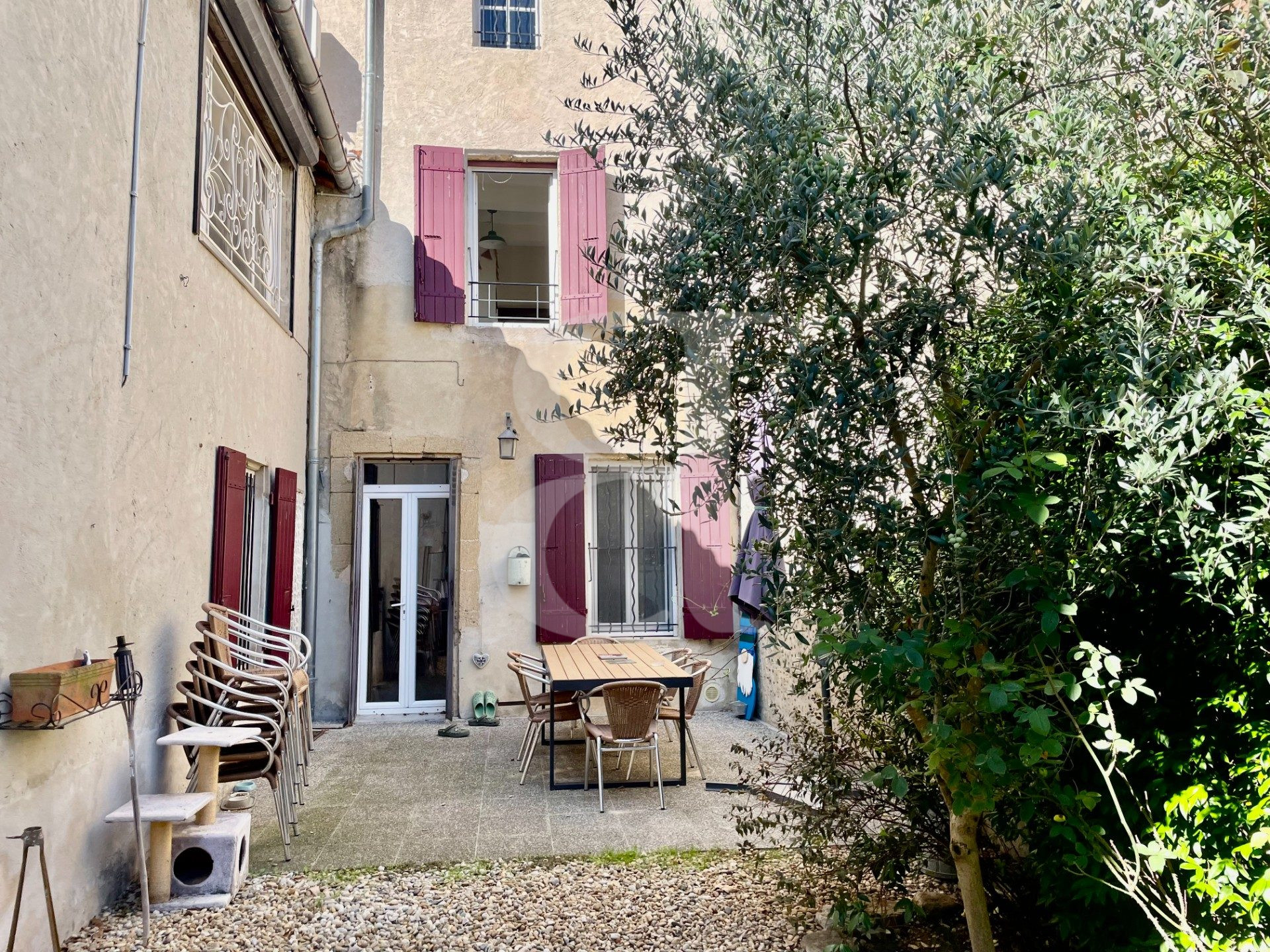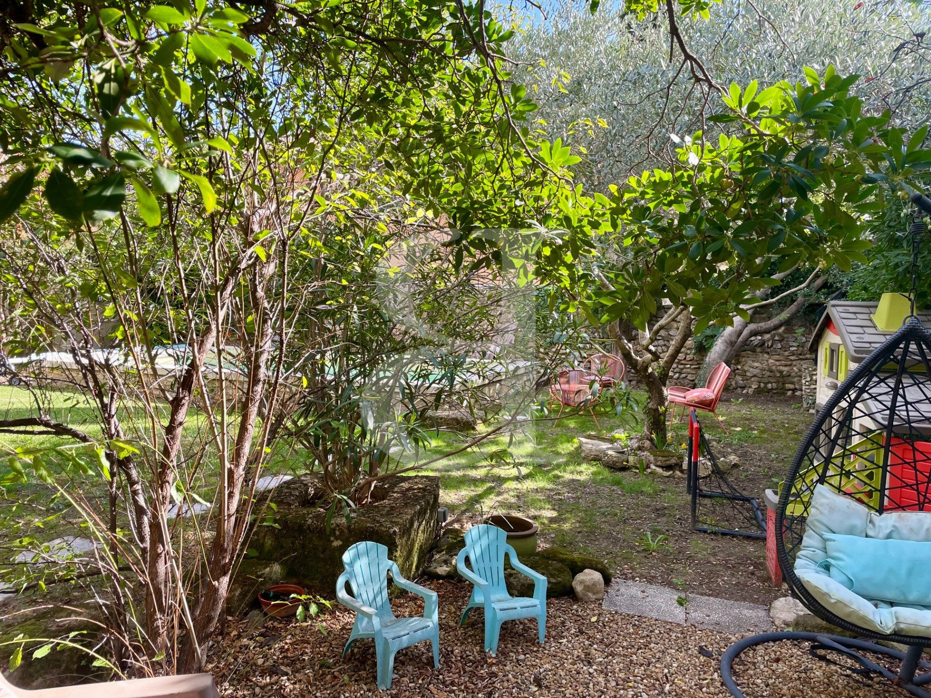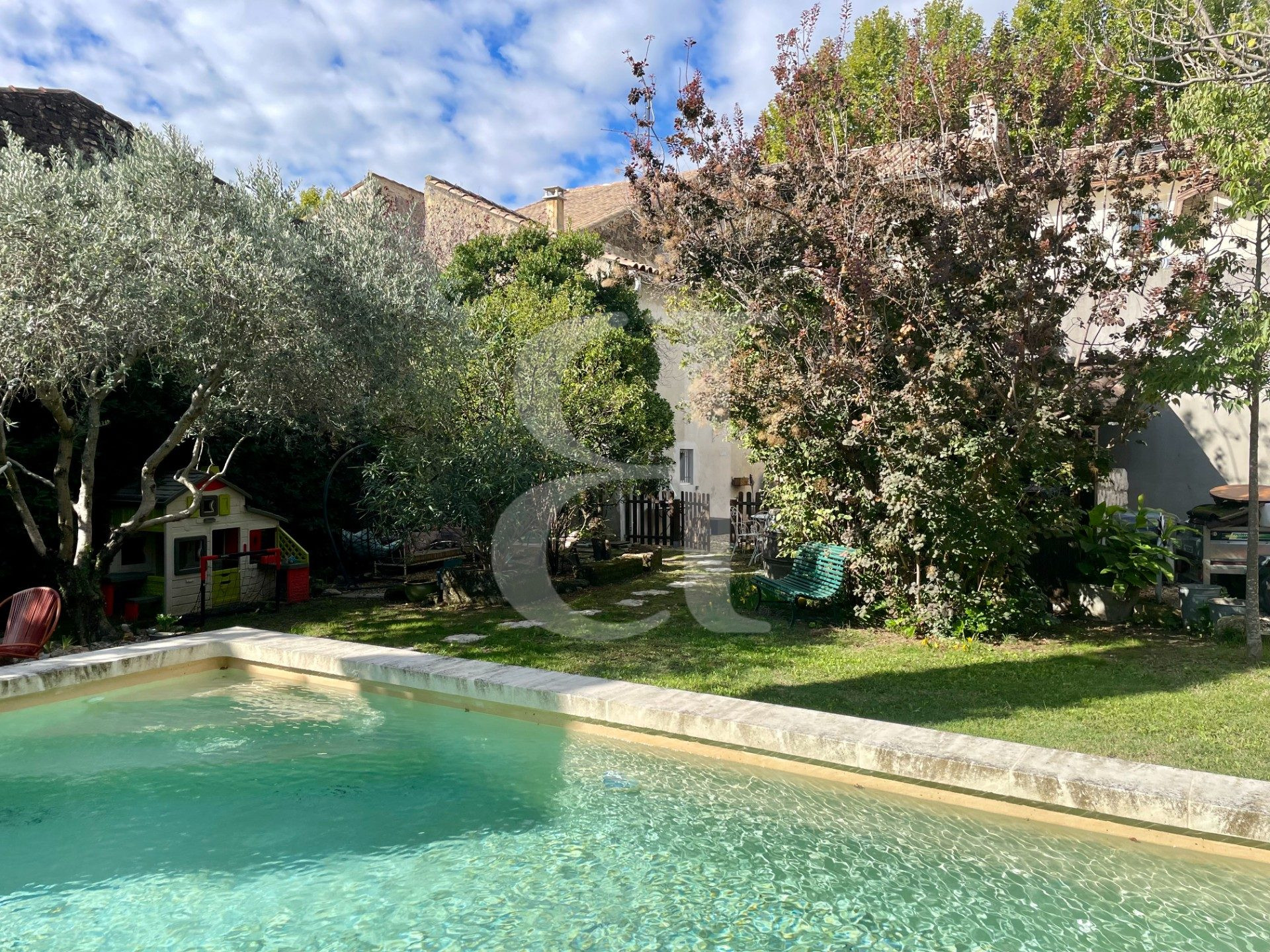 À l'extérieur, le jardin bucolique, entièrement clos et agrémenté d'un portail, accueille une piscine de type bassin ainsi qu'un bel espace terrasse avec cuisine d'été, parfait pour profiter du calme et de la douceur provençale.
