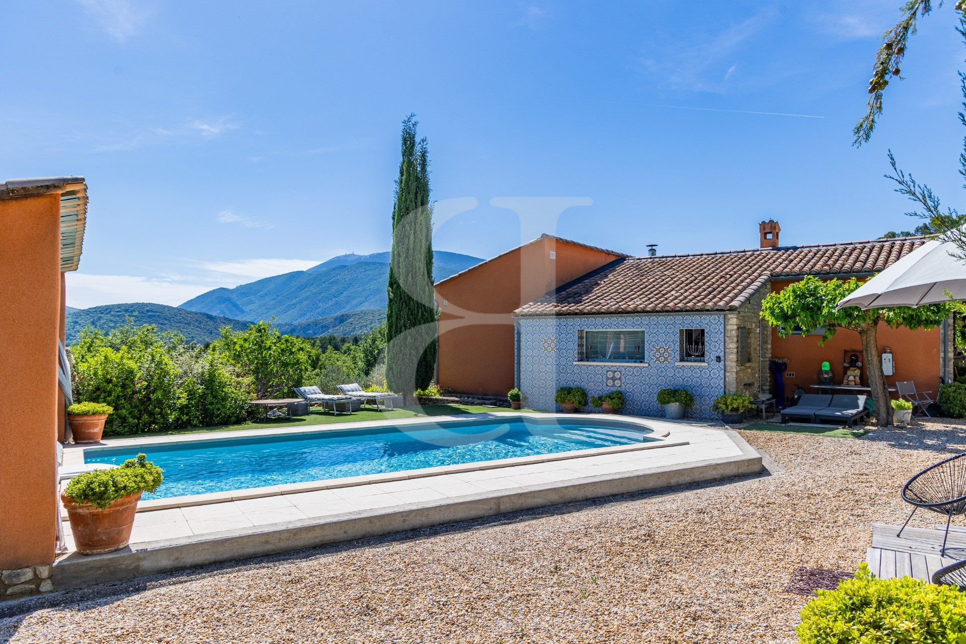 L'espace de vie de plain-pied s'ouvre sur une pièce de jour de 80 m² baignée de lumière, prolongée par une terrasse panoramique offrant une vue spectaculaire sur le Géant de Provence. Trois chambres indépendantes, chacune avec leur salle d'eau, garantissent confort et intimité pour accueillir famille, amis ou projets personnels.