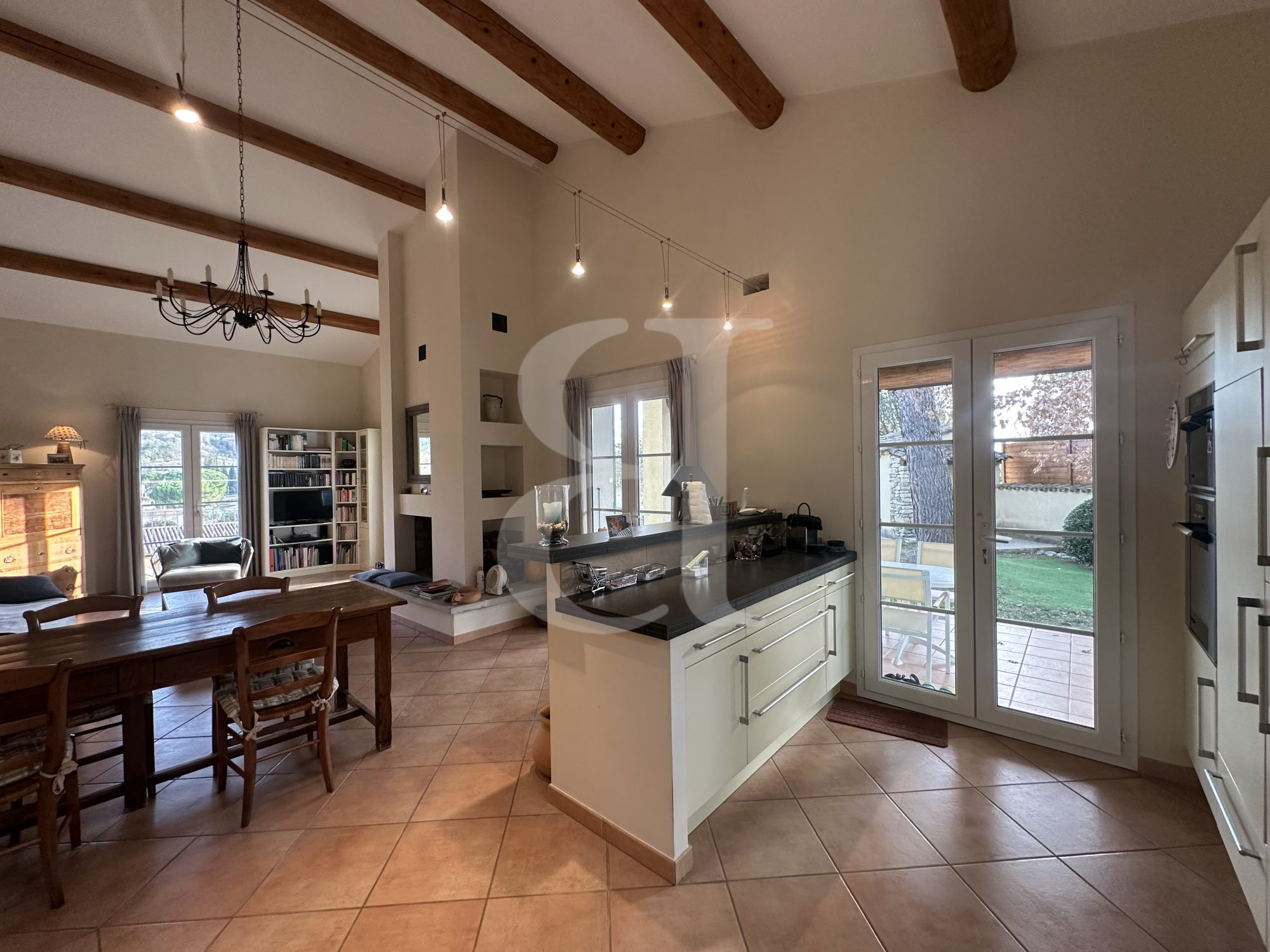 Cuisine équipée et salon cathédrale avec cheminée accès terrasse 41m²