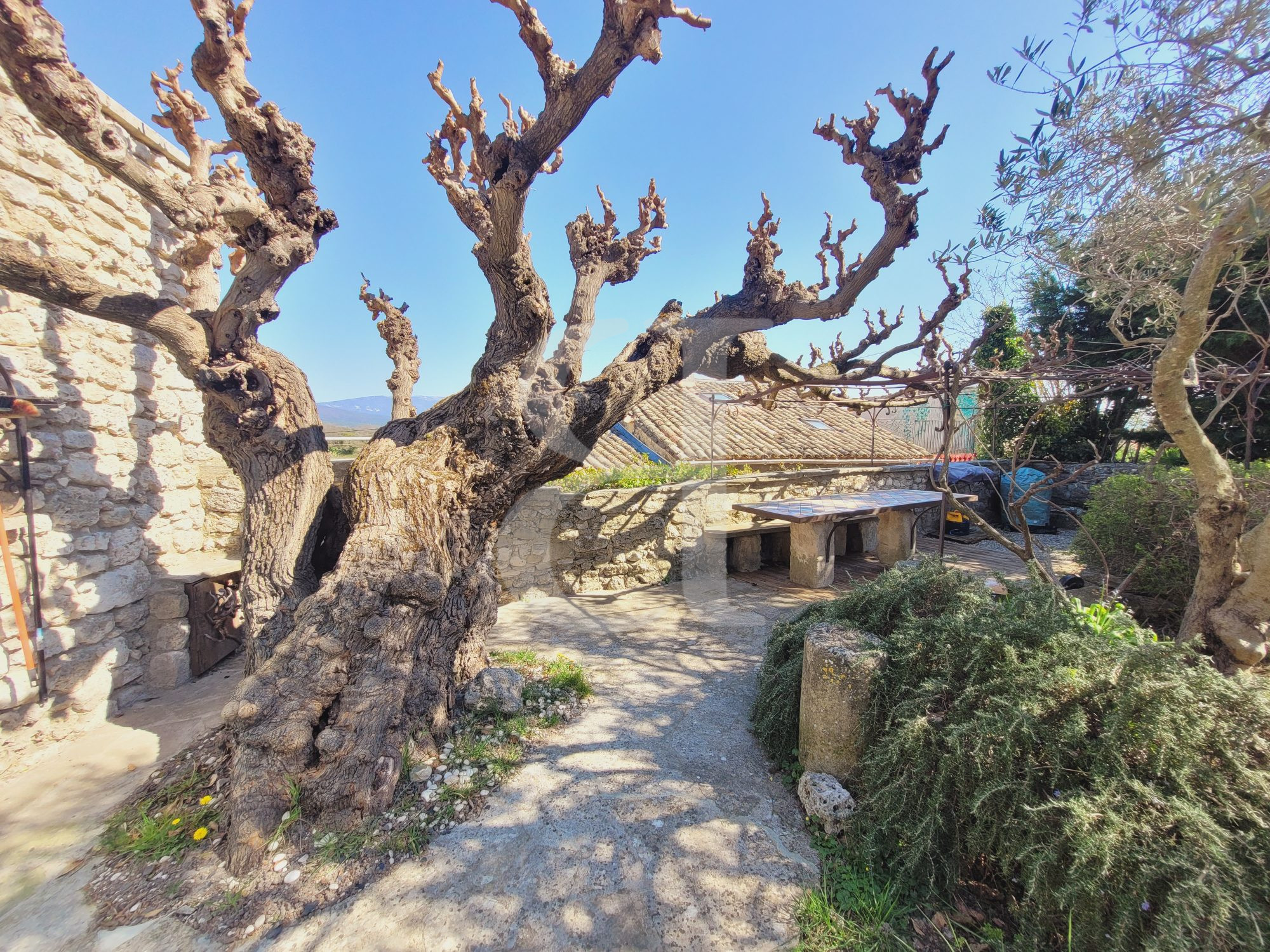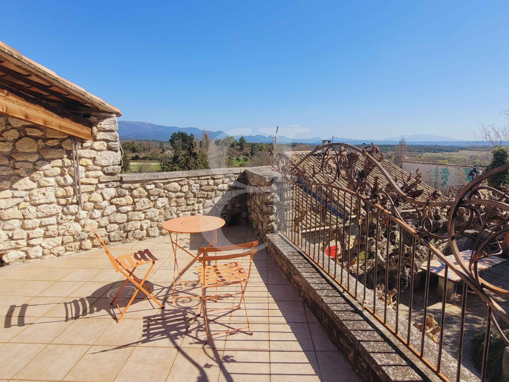 Exposée plein sud, la propriété bénéficie d'une luminosité idéale tout au long de la journée. Elle s'ouvre sur de magnifiques terrasses, dont une couverte, invitant à la détente face à une vue imprenable sur le Mont Ventoux et la campagne environnante, un véritable tableau vivant à chaque saison.