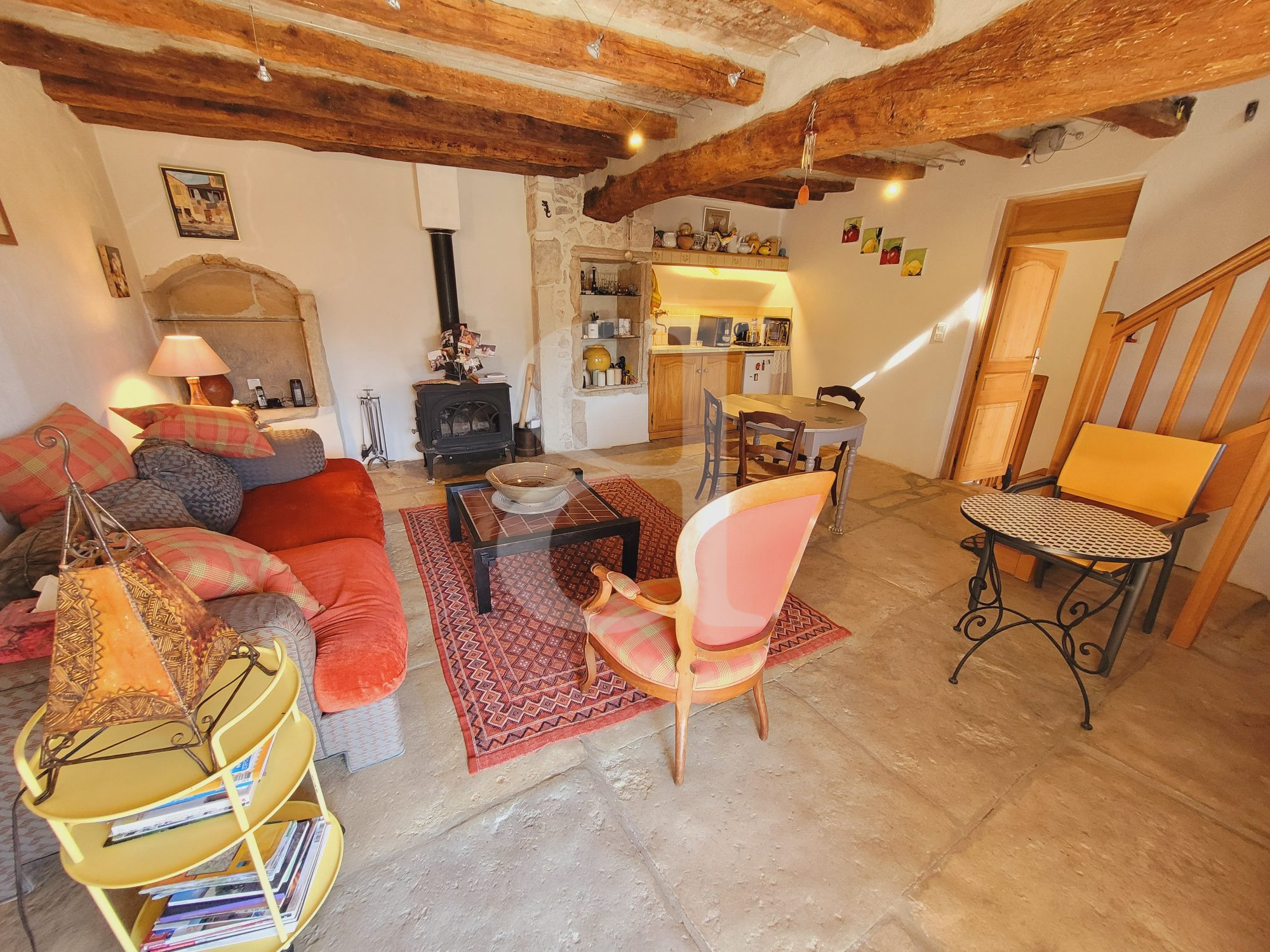 Pièce à vivre / coin cuisine 23 m² avec poêle à bois et ouvrant sur terrasse 10 m²