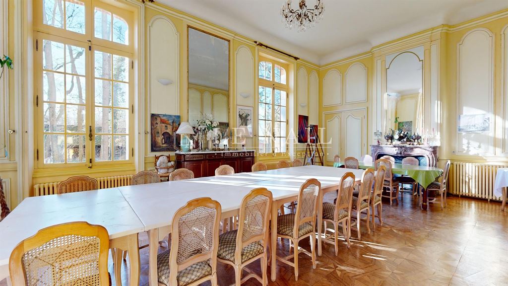 À gauche, une magnifique salle de réception de 77 m², aux volumes remarquables pouvant accueillir de nombreux convives, sublimée par un parquet en marqueterie ; à droite, un salon plus intimiste de 45 m², également doté d’un parquet en marqueterie, agrémenté d’une imposante cheminée en bois et béné-ficiant d’un accès direct à la terrasse, revêtue de carreaux de ciment.