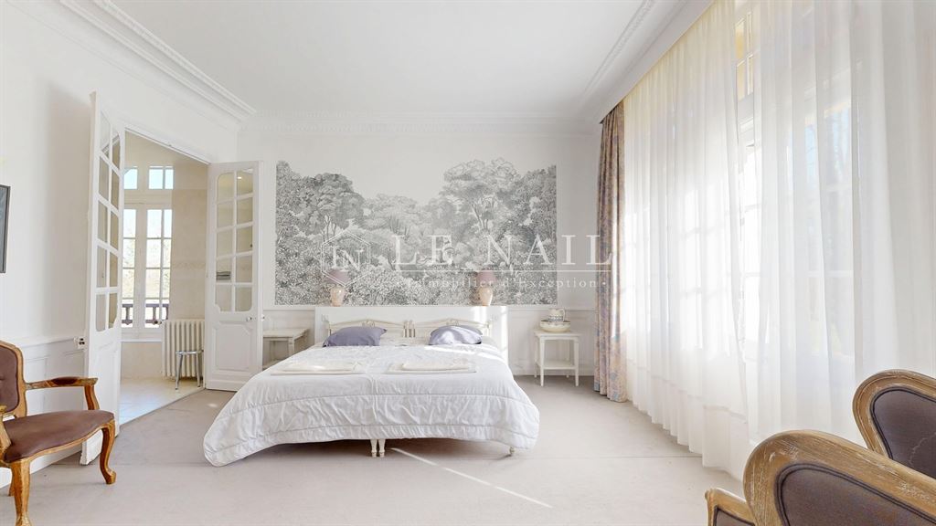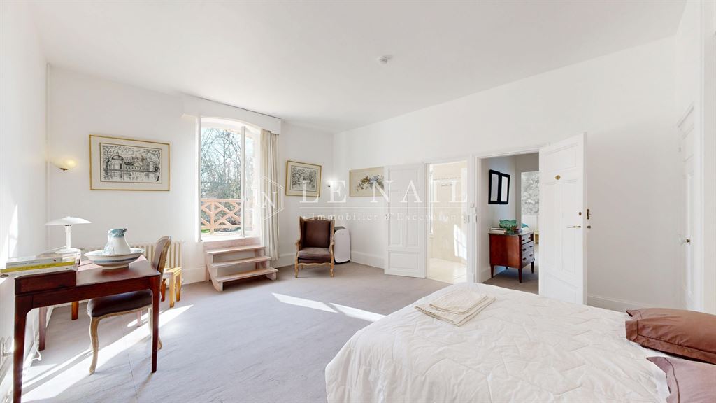 Le premier étage, desservi par un très bel escalier, accueille une chambre principale de 35 m² avec salle de bains, deux autres chambres disposant chacune de leur salle de bains et d’un accès à un large balcon, ainsi que trois chambres supplémentaires, dont l’une de 28 m², toutes équipées de salles de bains. Une lingerie de 10 m² complète ce niveau.
