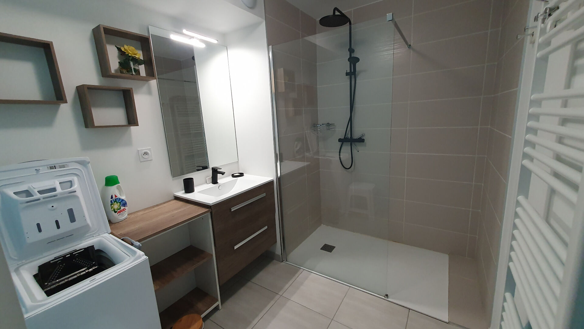L'appartement dessert en plus une chambre indépendante de près de 11 m², une salle d'eau avec douche à l'italienne et un WC indépendant.