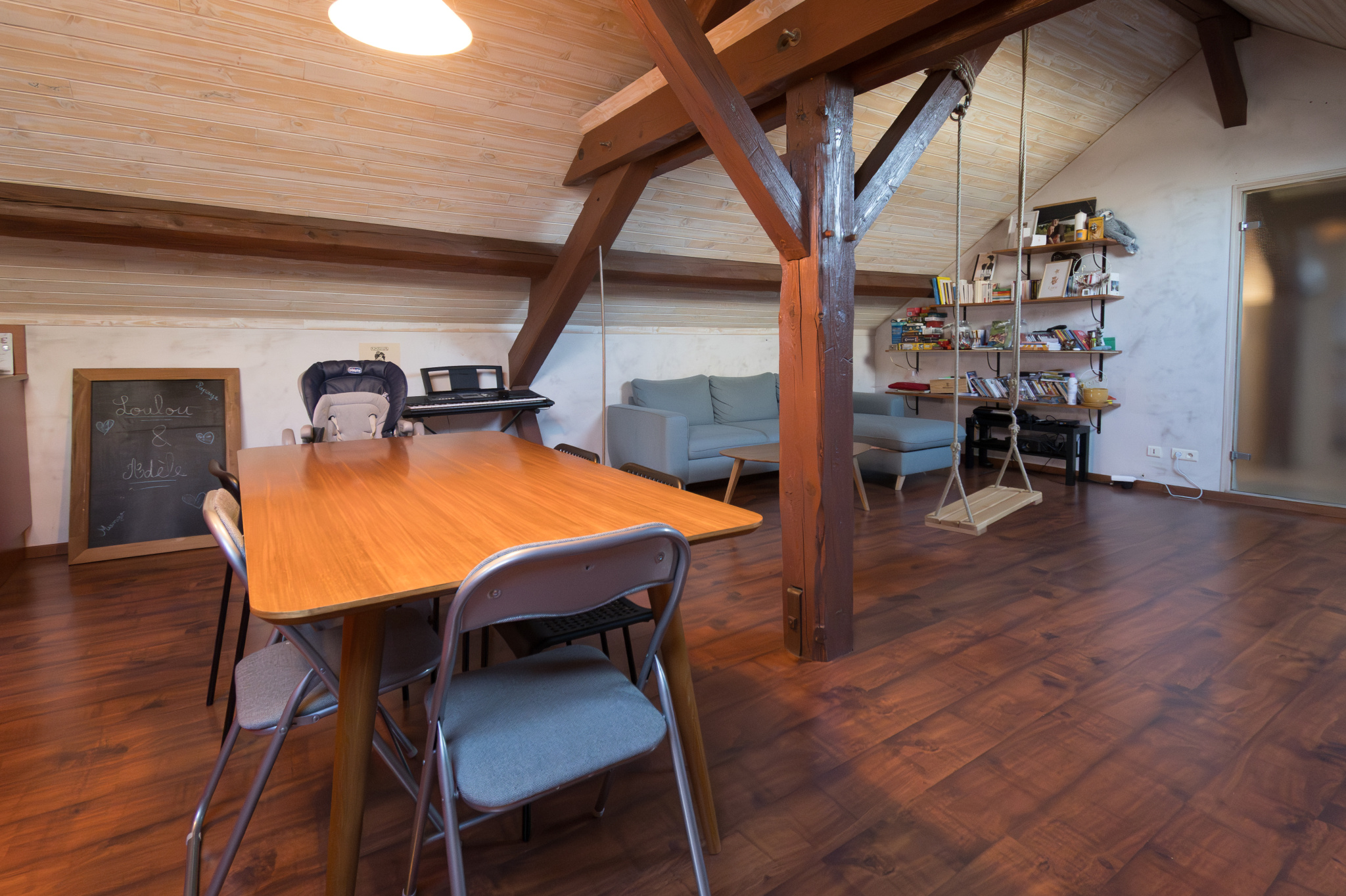 PONTARLIER - CENTRE VILLE : Appartement atypique de type 2 de 68.4m2 dans une petite copropriété calme rénové en 2005. L'appartement se compose d'une entrée, une vaste cuisine ouverte sur séjour de 34m2, une chambre, wc avec buanderie, une salle de bains et une cave. Poêle à granulé.