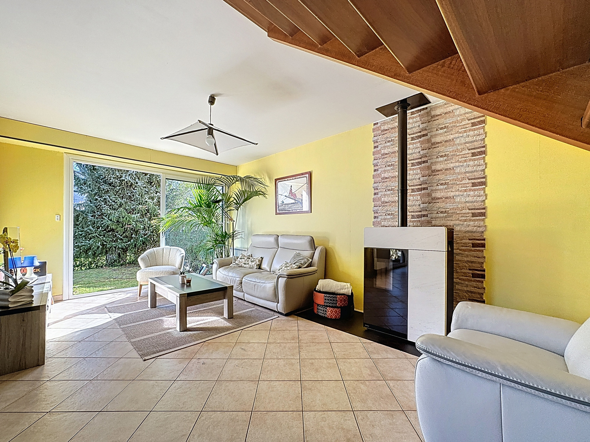 Elle se compose au rez de chaussée d'une cuisine indépendante aménagée et équipée, d'un séjour/ salon avec son poële à granulés donnant sur un jardin à l'abris des regards.
