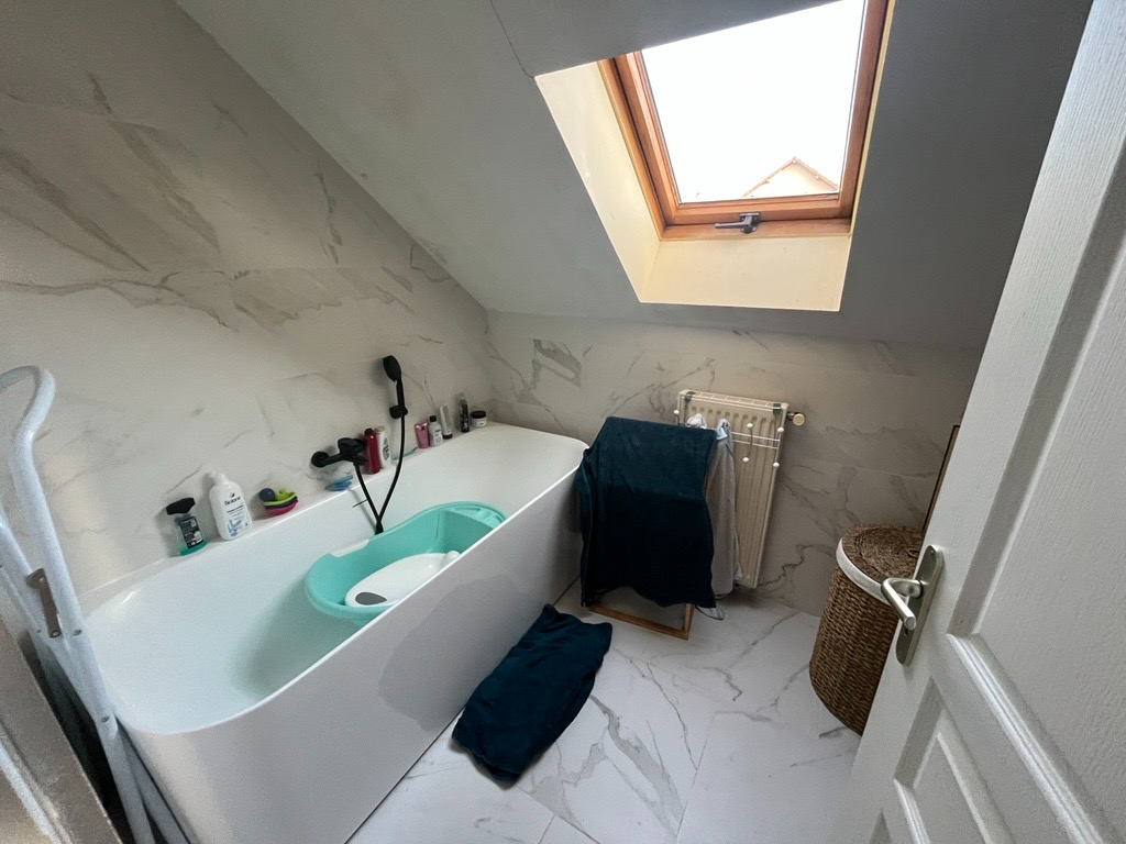 - à l'étage: 3 grandes chambres, une salle de bains avec wc et un cellier.
