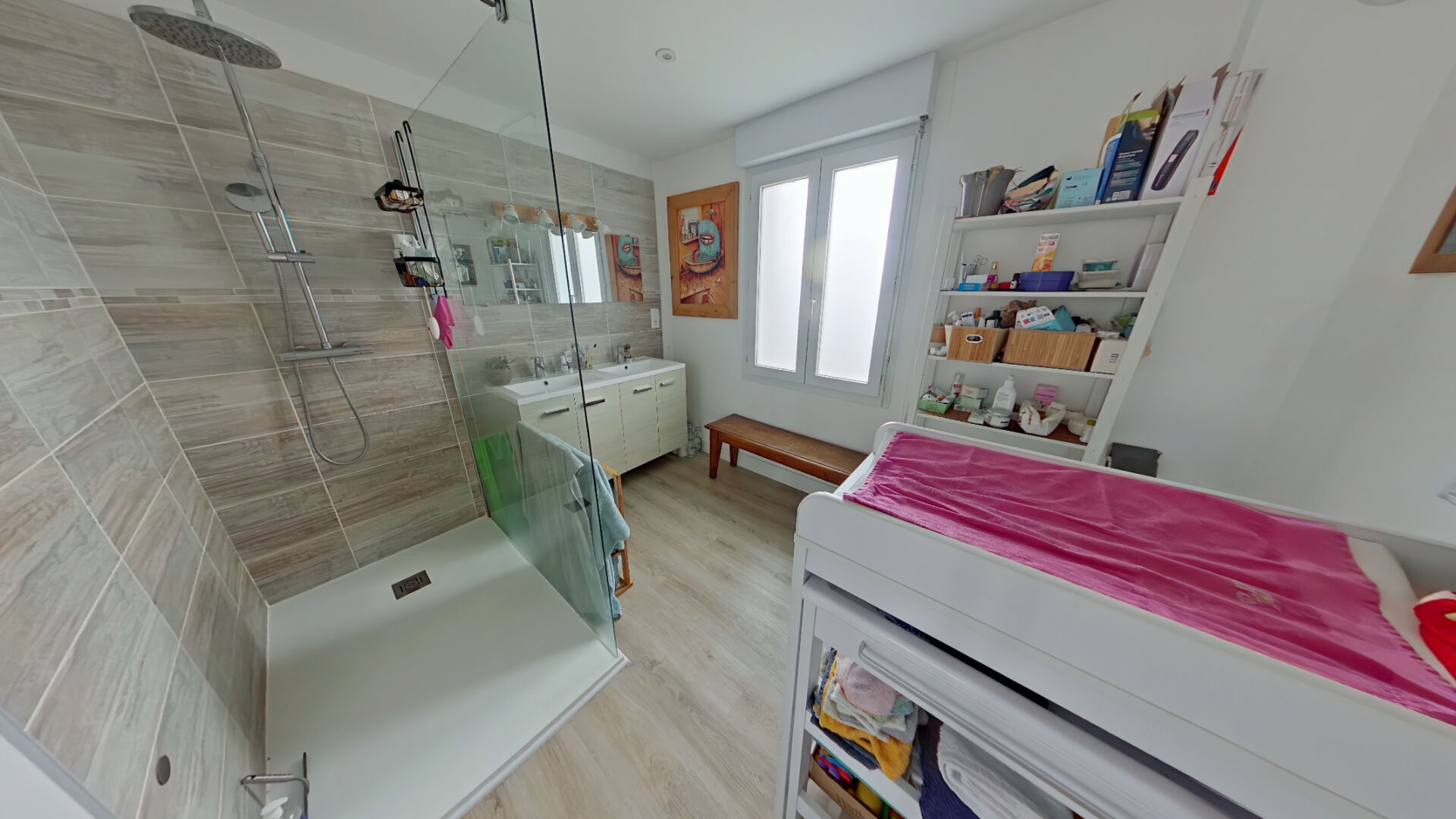 Sur 3 niveaux, elle se compose au rez-de-chaussée d'une entrée donnant sur le salon séjour, une cuisine aménagée et équipée, d'un wc et d'une grande terrasse.