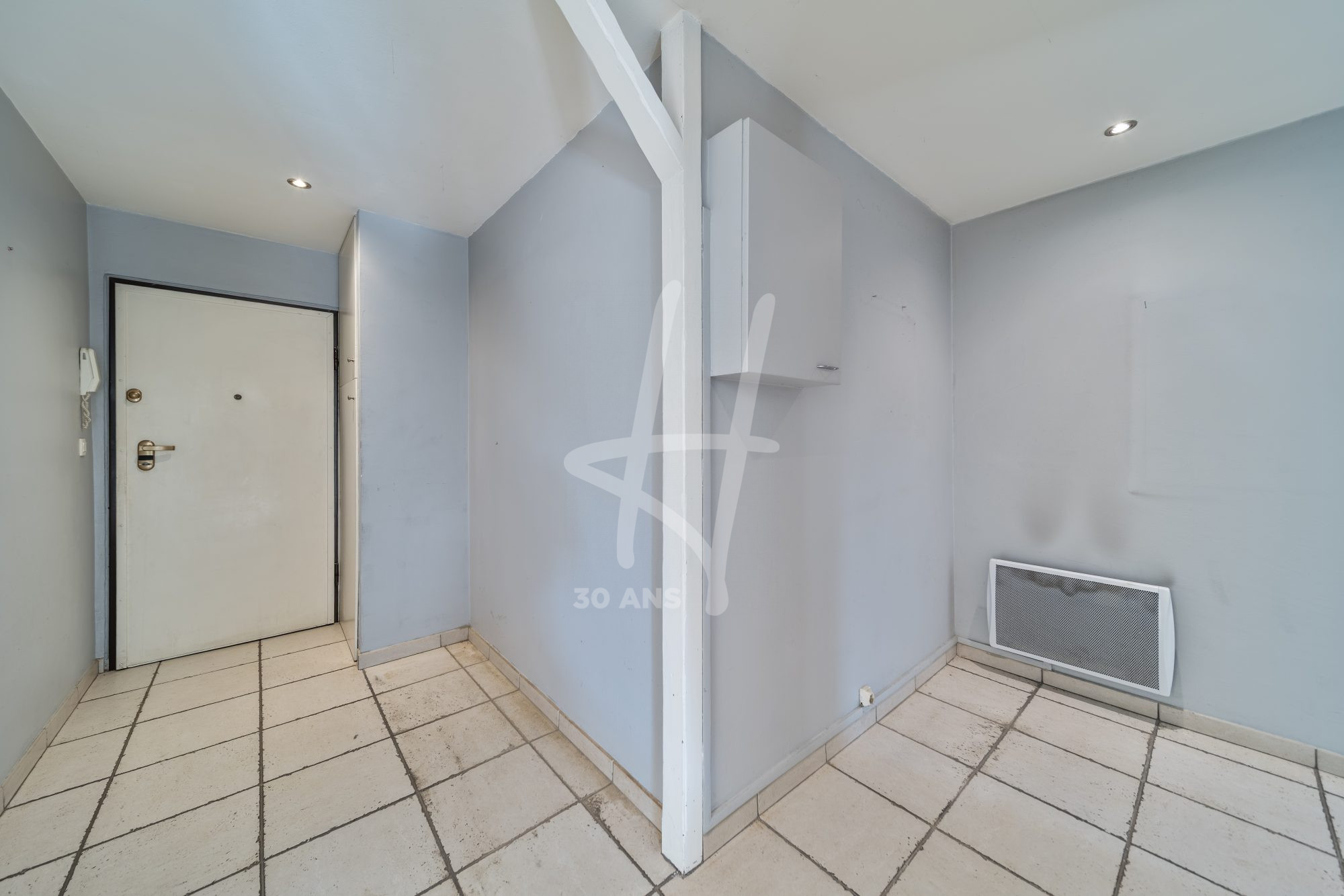 L'entrée dessert un dégagement avec placards, puis une double pièce de vie lumineuse avec cuisine ouverte équipée. Cet espace offre un accès direct à une terrasse appréciable au quotidien.