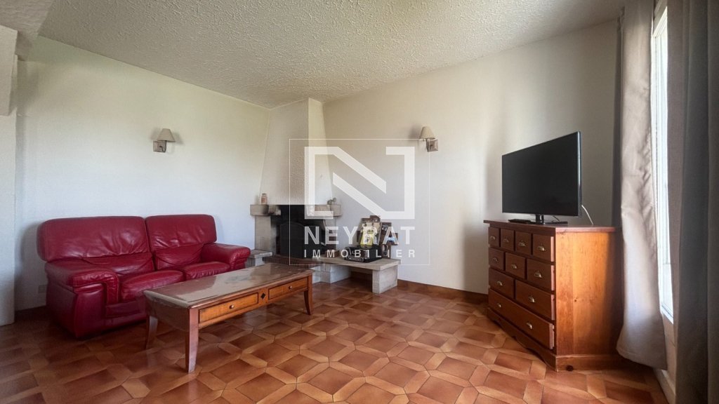 Le séjour-salon, baigné de lumière naturelle, est ponctué d'une cheminée et s'ouvre directement sur le jardin, créant une belle continuité entre intérieur et extérieur.