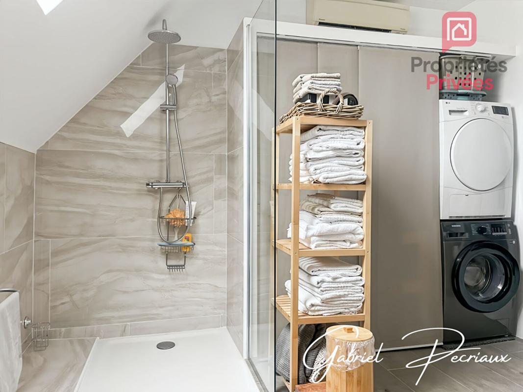 A l'étage, l'espace nuit propose 3 chambres confortables (environ 10, 11 et 12,5 m²), une spacieuse salle de bains de 13,5 m² avec douche et baignoire, ainsi qu'un véritable atout : un dressing linéaire de 9 mètres, parfaitement optimisé.
