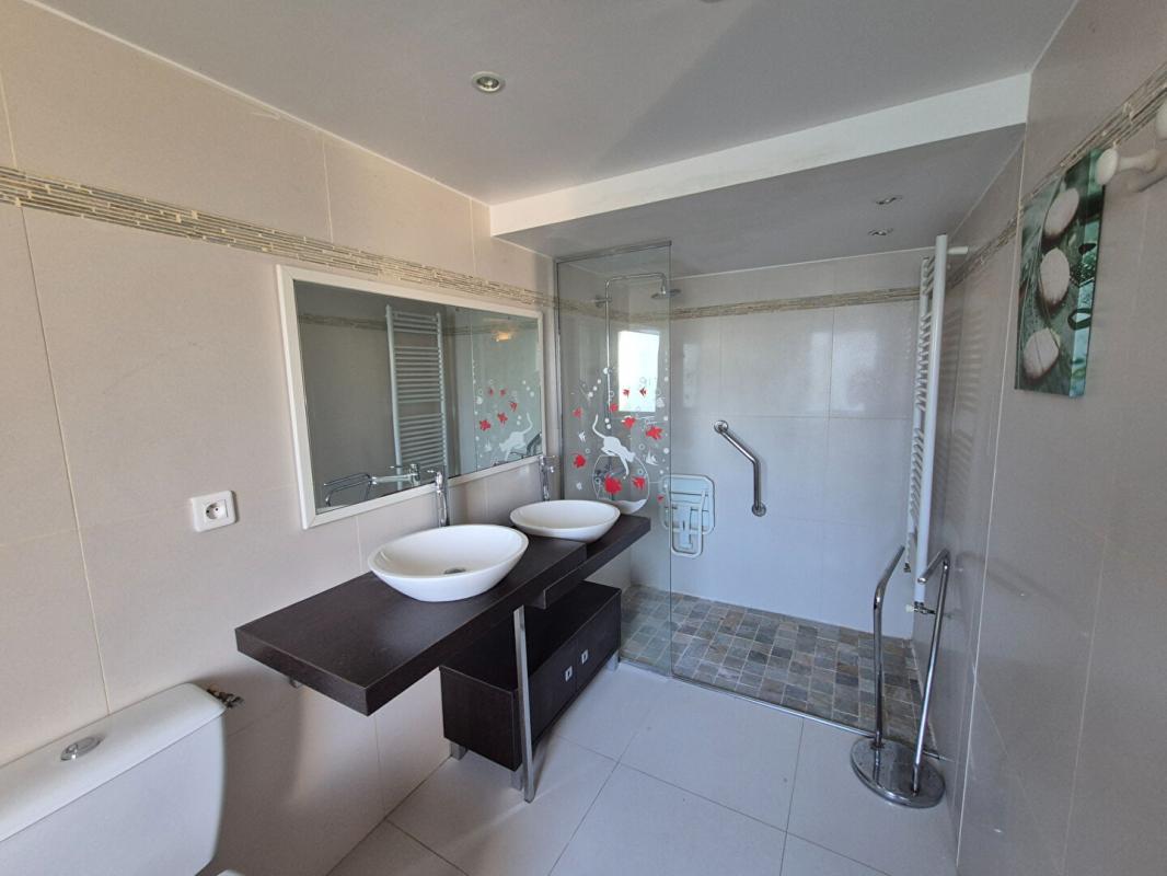 A l'étage (accès plain-pied) : Vaste séjour avec cheminée, bar avec point d'eau, salle à manger, dressing, 2 grandes chambres avec sanitaires privatifs (salle d'eau + WC / salle de bains + WC), terrasse en bois et pergola.