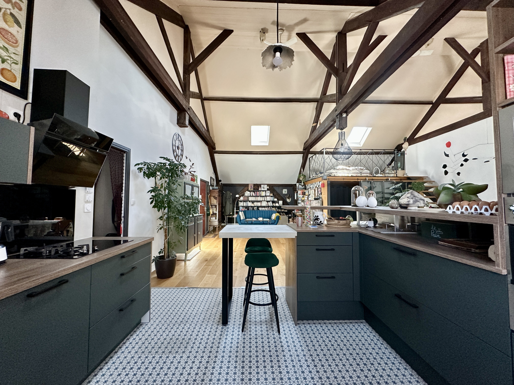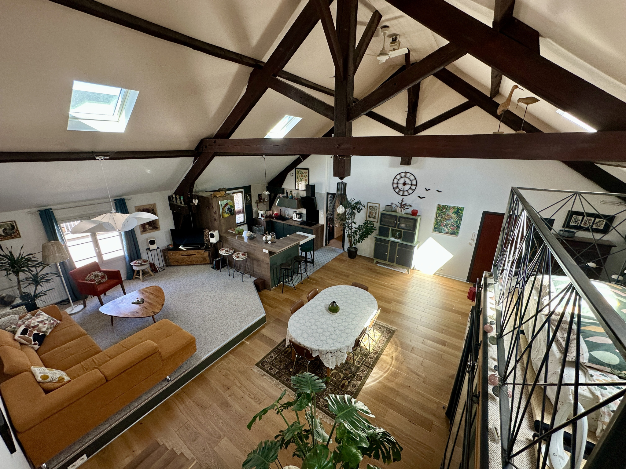 Magnifique pièce de vie avec toit cathédrale de 89 m2, comprenant une cuisine aménagée et équipée ouverte.