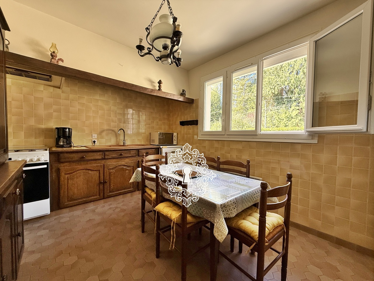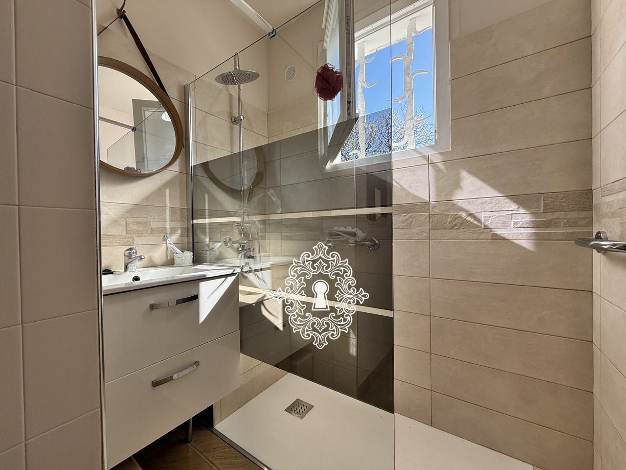 véranda, entrée, séjour, cuisine, 2 chambres, salle d'eau, wc, buanderie, douche,