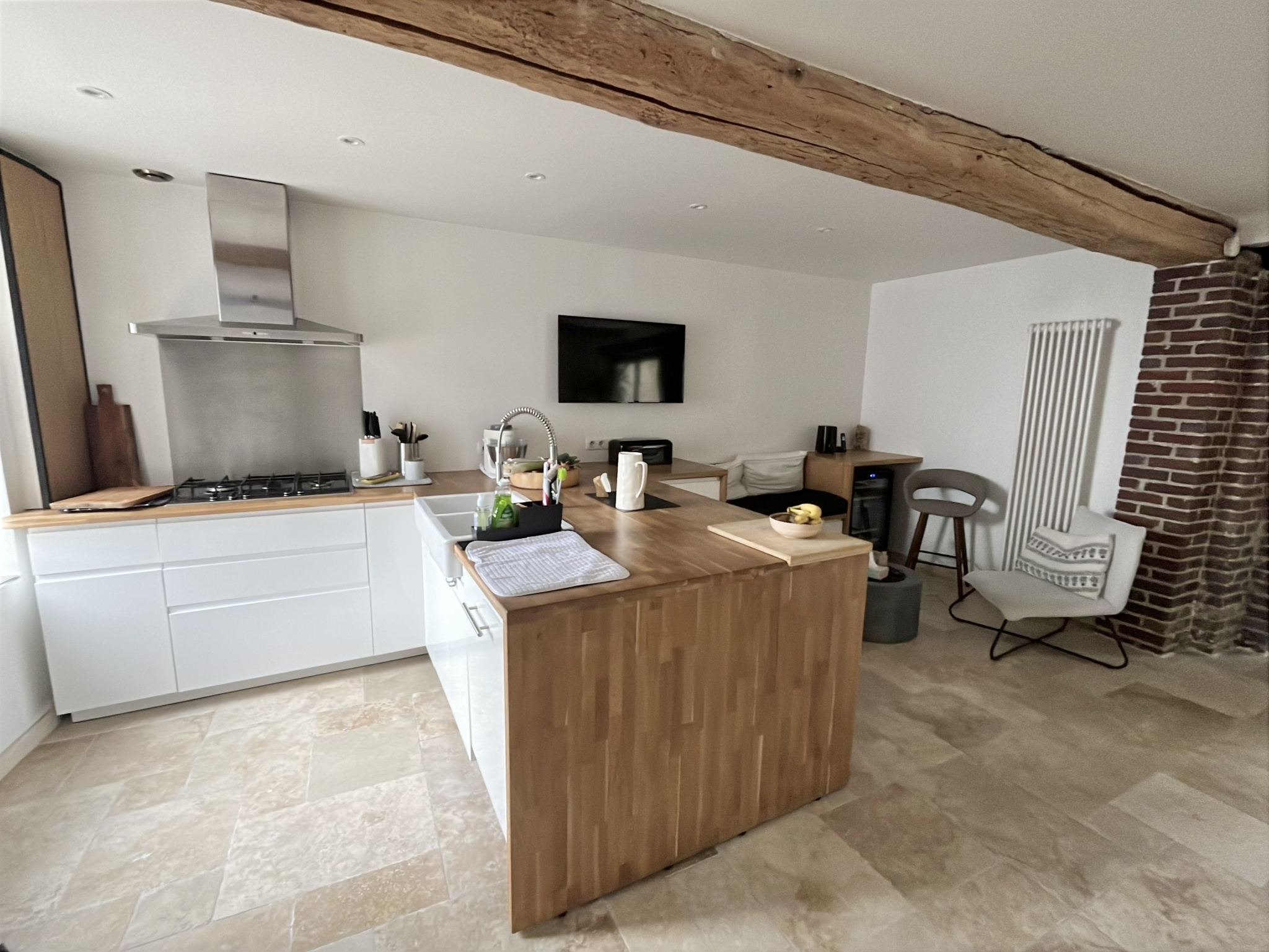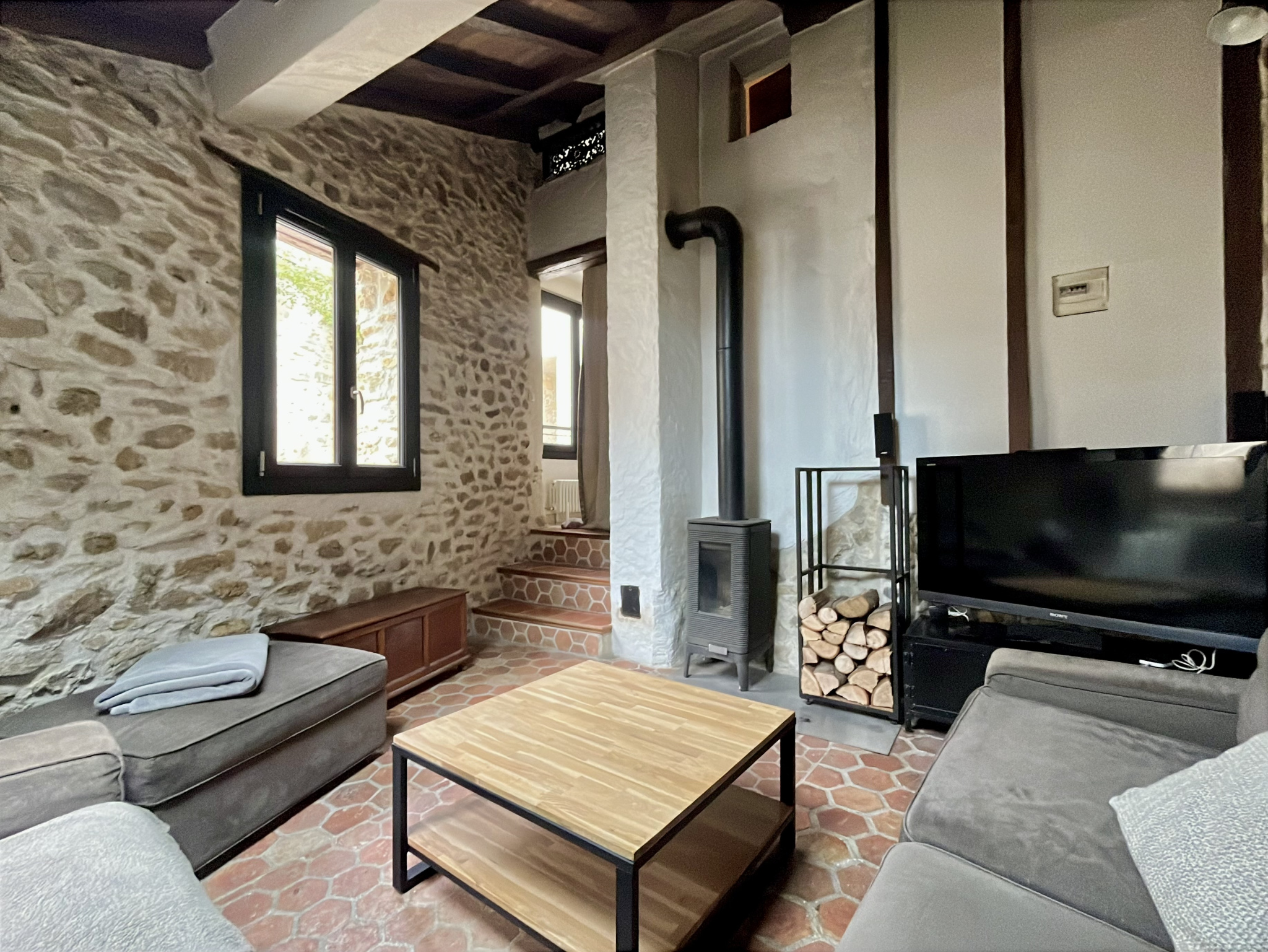 - au rez-de-chaussée : une entrée, un séjour avec cuisine ouverte entièrement aménagée et équipée, un salon avec poêle à bois, un dégagement et un WC.